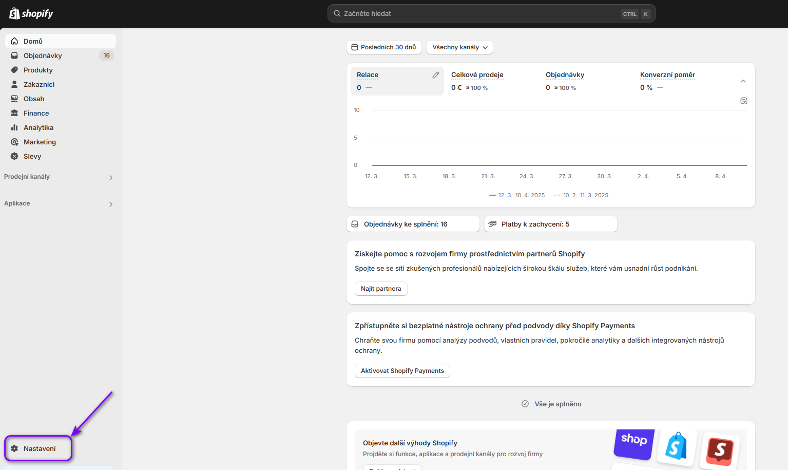 - Krok 1: V administraci Shopify klikněte na Nastavení