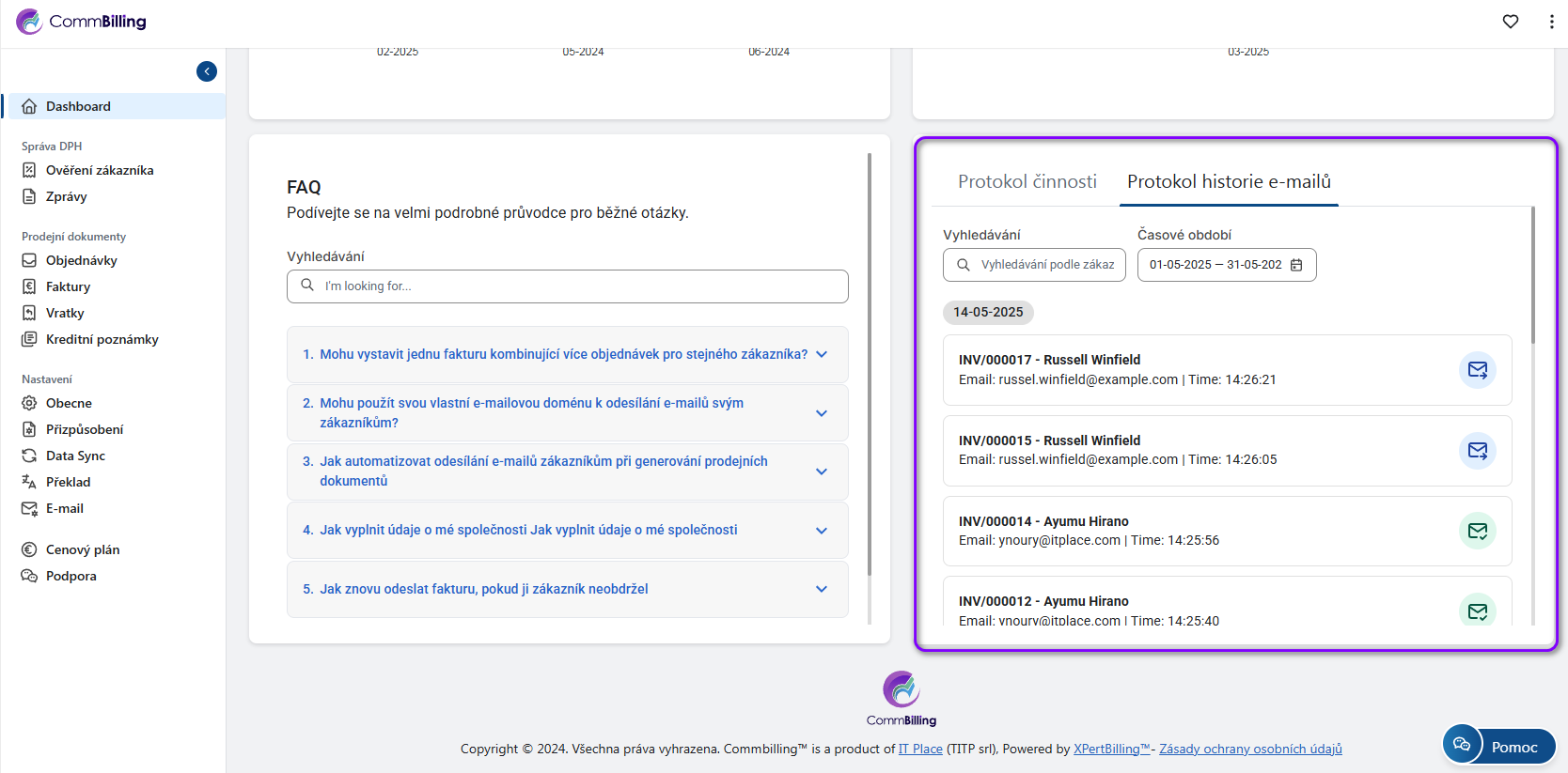 Sekce Historie e-mailů sleduje všechny e-maily odeslané z CommBilling, včetně: