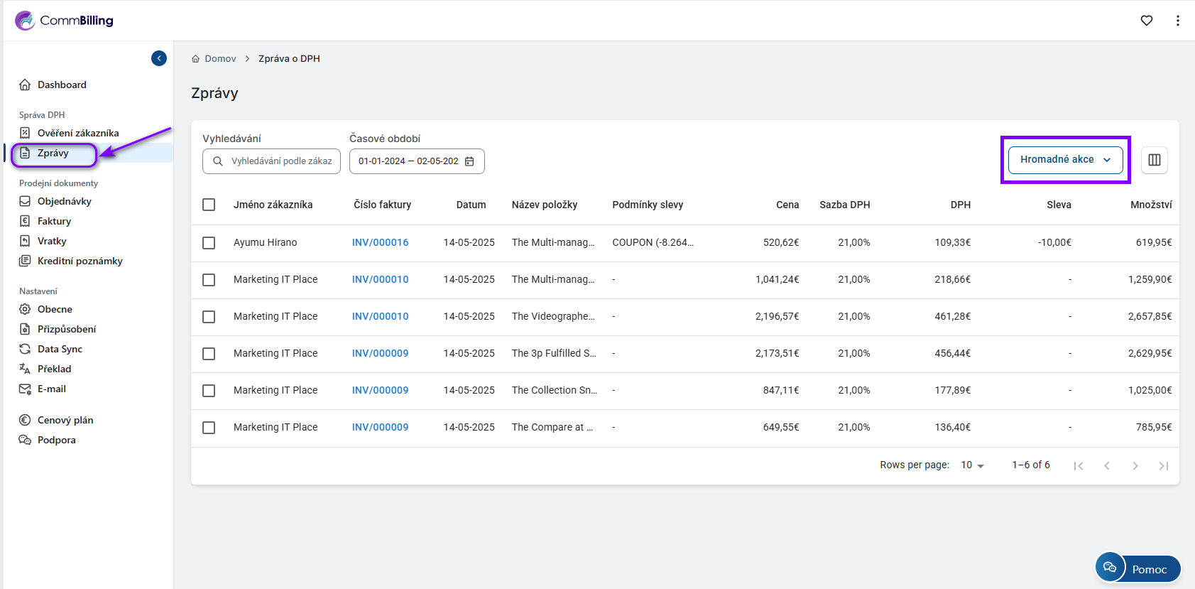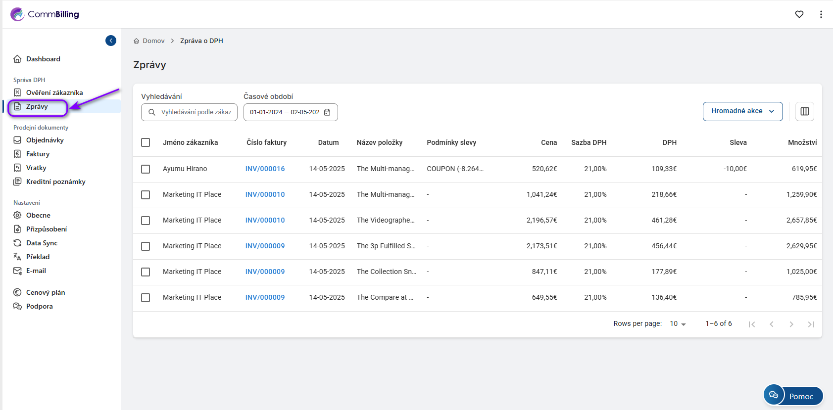 V CommBilling daňové zprávy poskytují organizovaný pohled na všechny objednávky a faktury spolu s DPH aplikovaným podle země. S možnostmi filtrování a hromadnými akcemi můžete snadno přizpůsobit a exportovat zprávy, což usnadňuje správu finančního výkaznictví a udržuje soulad s daňovými povinnostmi.