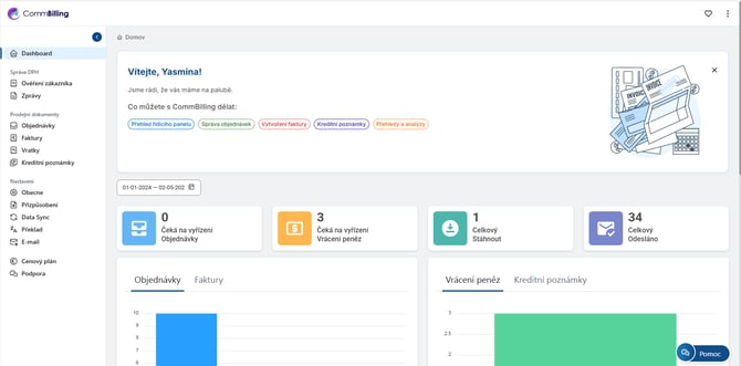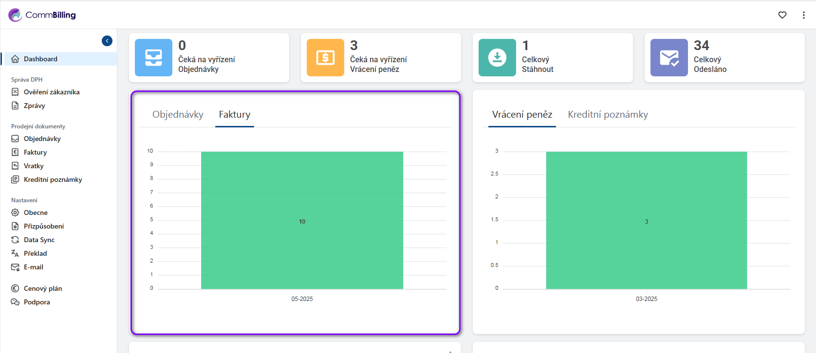 CommBilling vám umožňuje sledovat počet faktur vygenerovaných v aktuálním měsíci přímo z řídicího panelu.