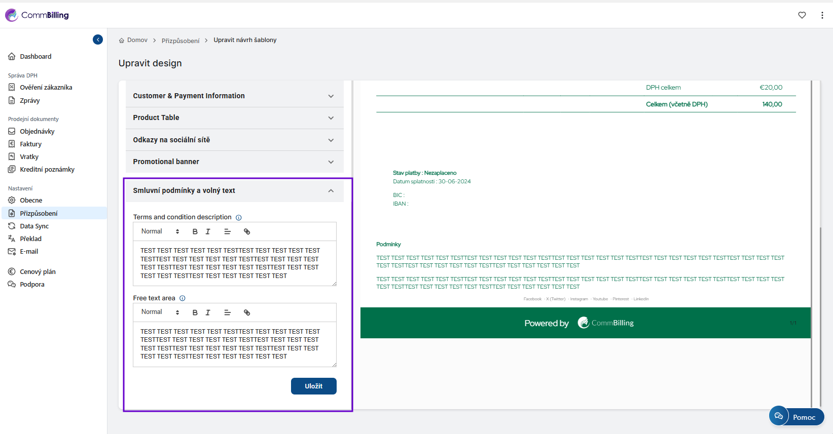 • Krok 6: V živém náhledu zkontrolujte zda se váš text na rozložení faktury zobrazuje správně.