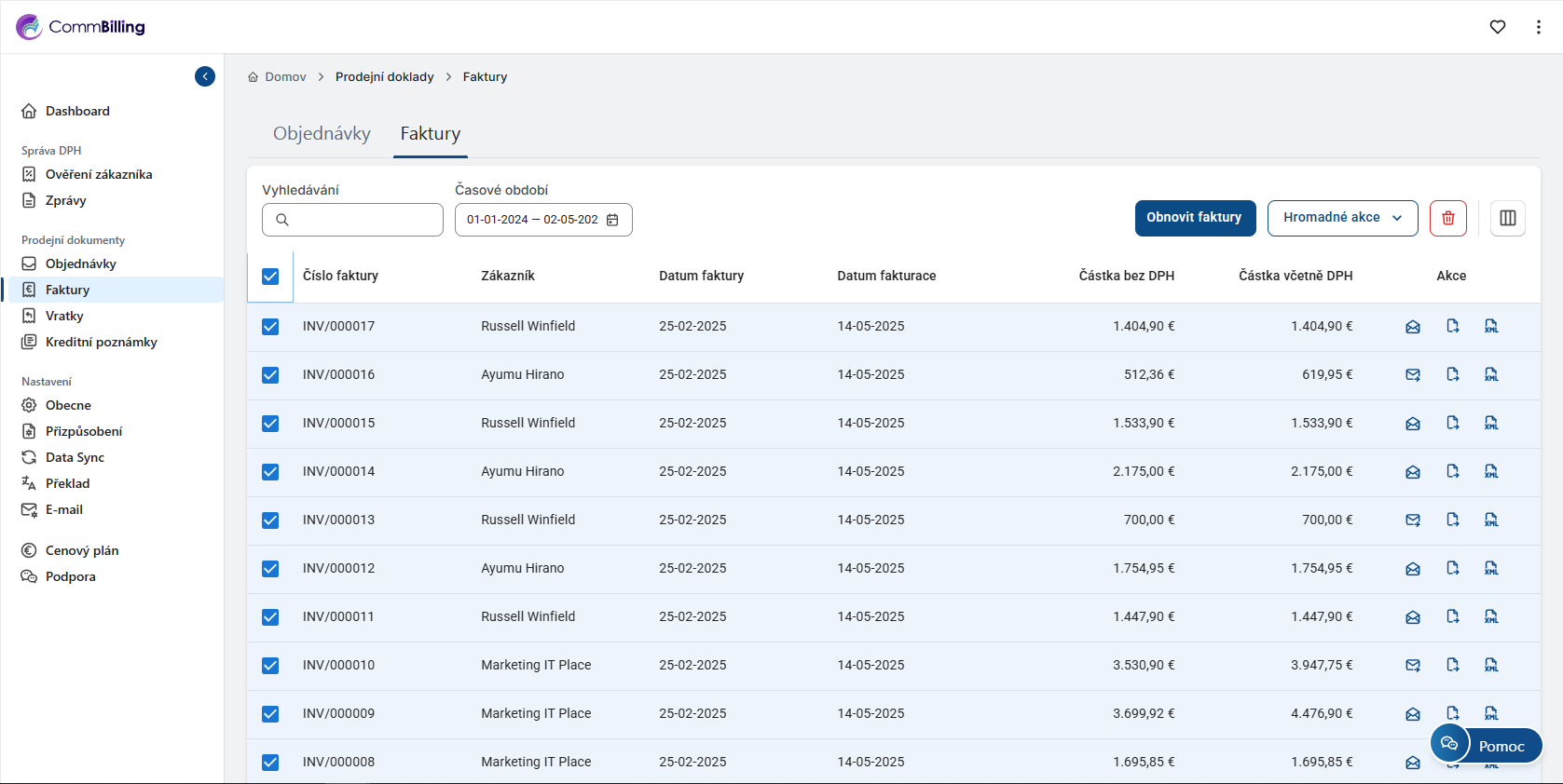 Tisk faktur v CommBilling zahrnuje stažení faktur jako souborů PDF a následný tisk z počítače. Zde je postup: