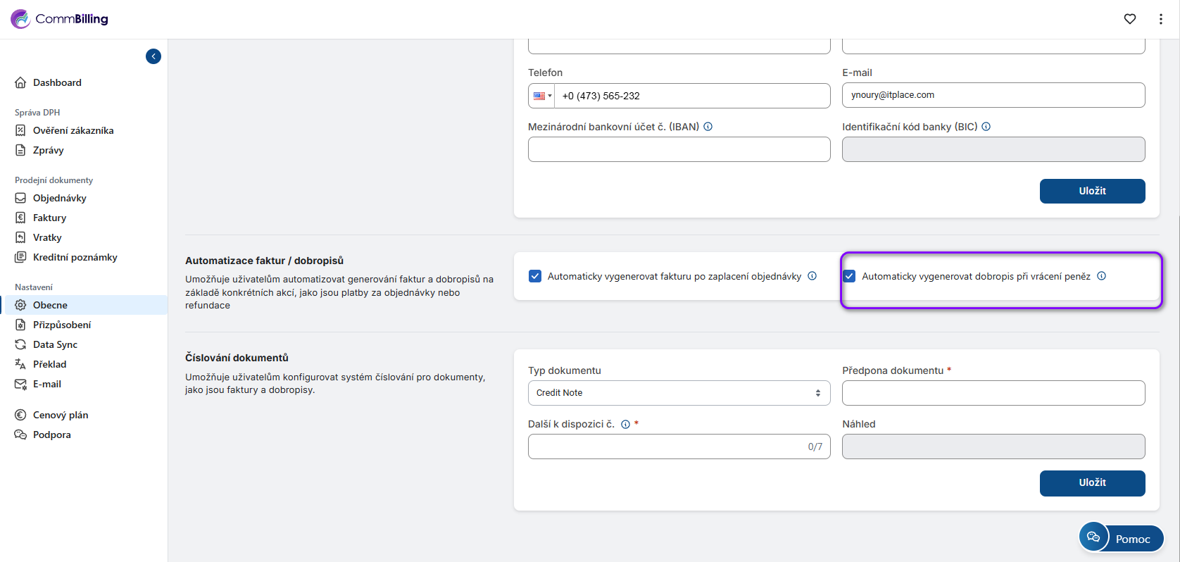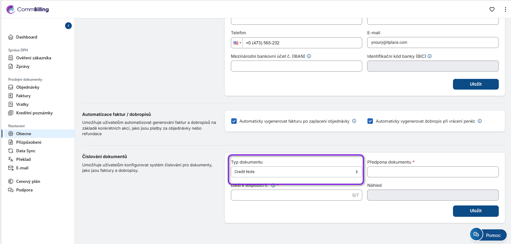 - Přejděte do obecného nastavení CommBilling, sekce "Automatizace faktur / dobropisů".