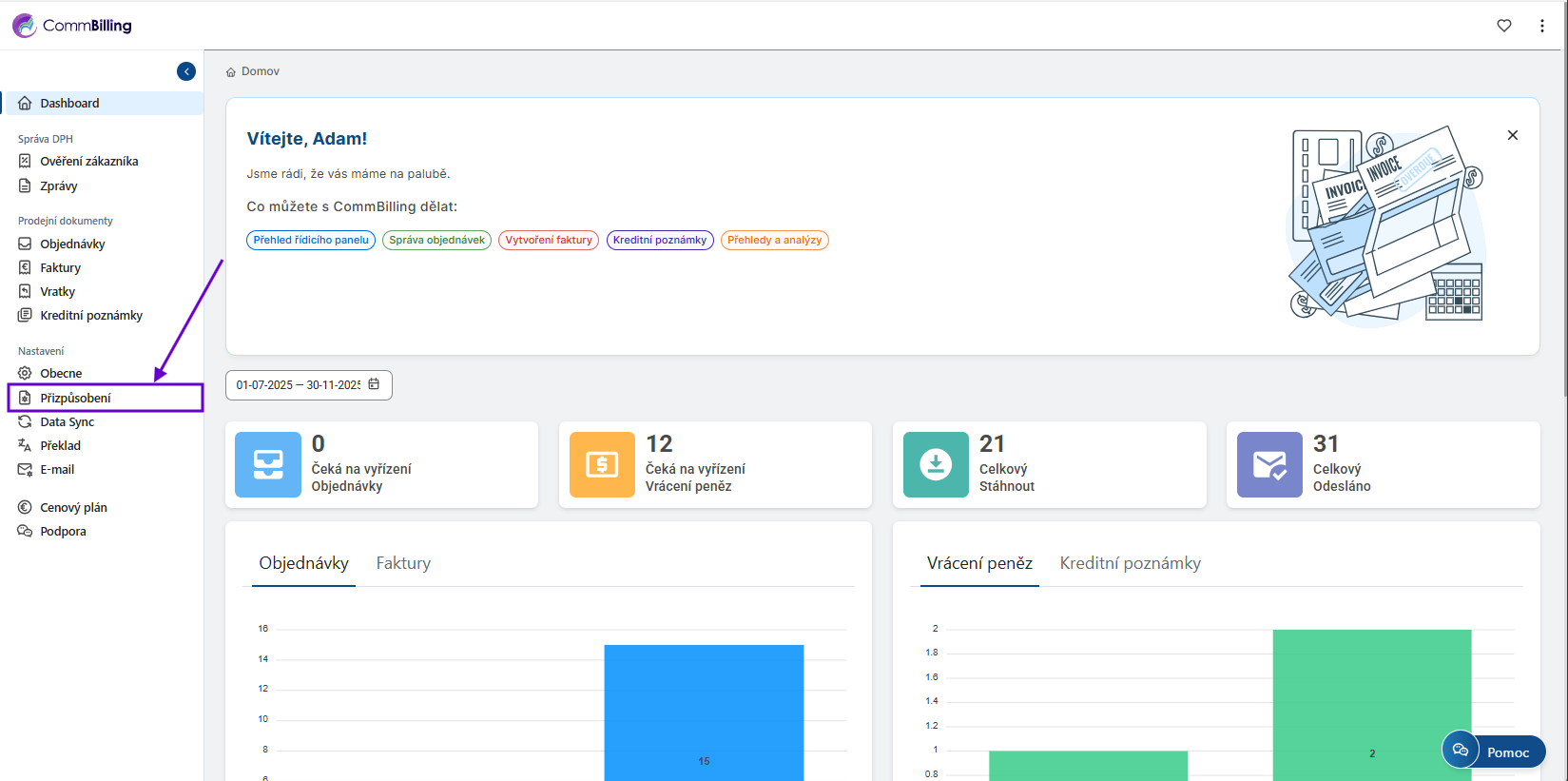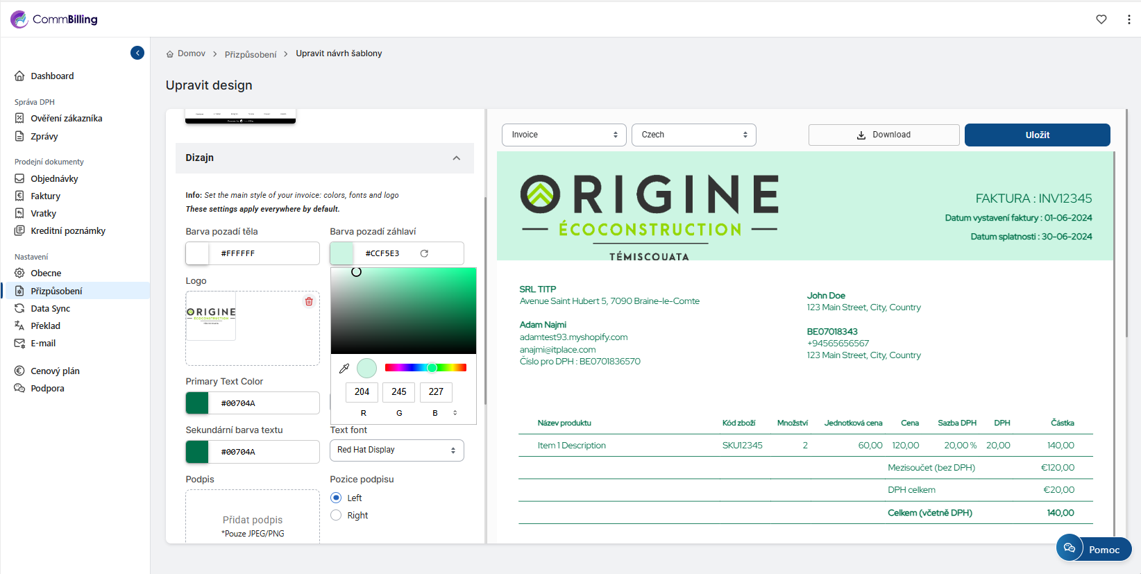 Díky předdefinovaným profesionálním šablonám CommBilling začínáte již s designem připraveným pro podnikání. Možnost přizpůsobit si barvy pozadí, banneru a nadpisů navíc umožňuje, aby vaše faktury plně odrážely vizuální identitu vaší značky, a přitom si zachovaly jasnost a eleganci.