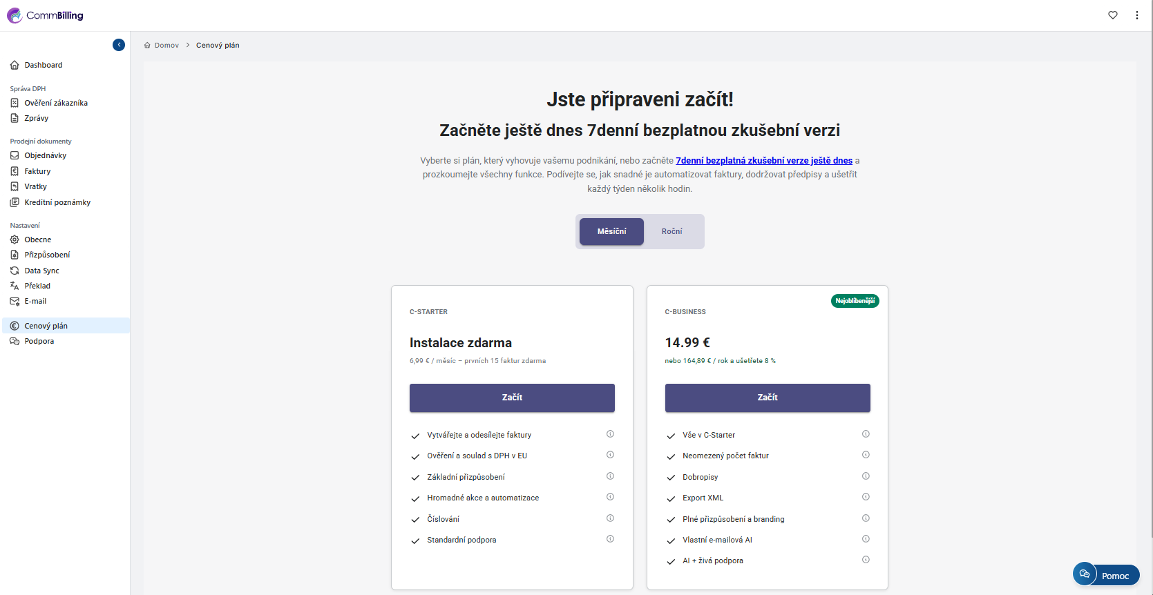 Karta Cenový plán je vaším centrálním místem pro výběr a správu předplatného. Díky sedmidenní bezplatné zkušební verzi dostupné u obou plánů můžete CommBilling zkoumat s jistotou a vybrat si plán který nejlépe podporuje váš fakturační proces a růst vašeho podnikání.