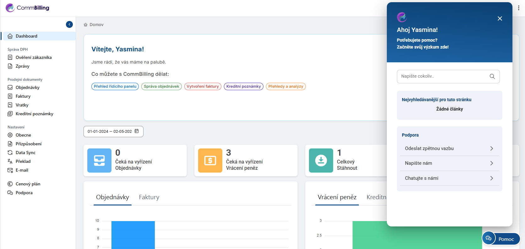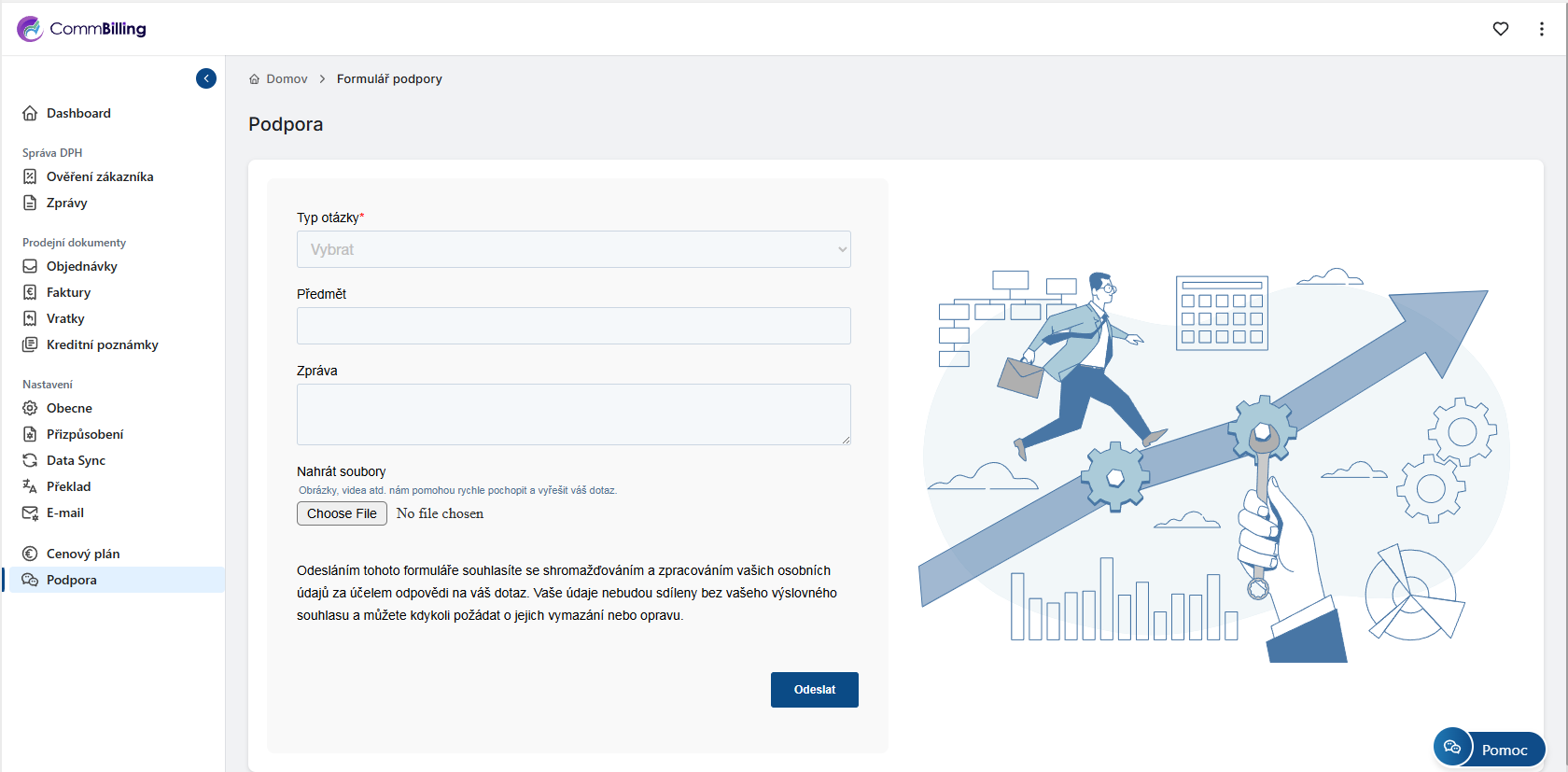 Karta Podpora v CommBilling poskytuje uživatelům snadný způsob, jak přímo kontaktovat tým podpory. Ať už potřebujete pomoc s řešením problémů nebo chcete poskytnout zpětnou vazbu, tato sekce je navržena tak, aby získání pomoci bylo přímočaré a efektivní.