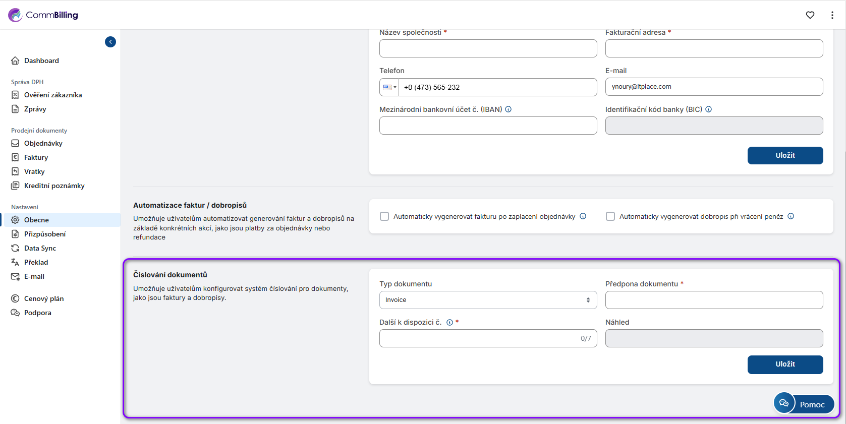 - Přejděte na Nastavení > Obecné a sekci Číslování faktur a dobropisů.