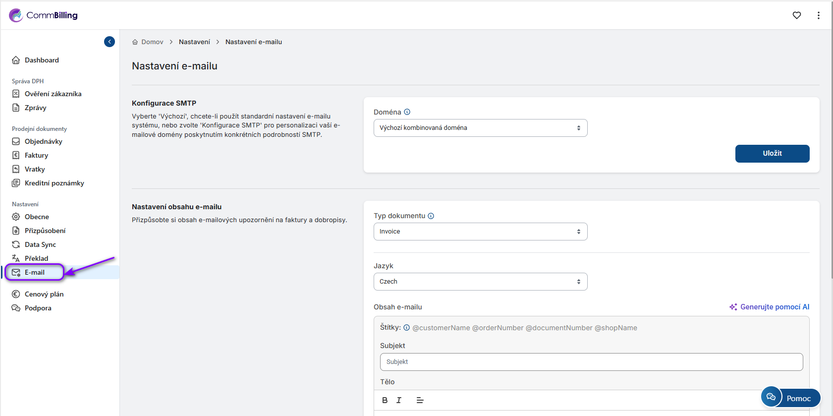 1. Otevřete CommBilling v Shopify.2. Přejděte do sekce Nastavení a vyberte kartu E-mail.