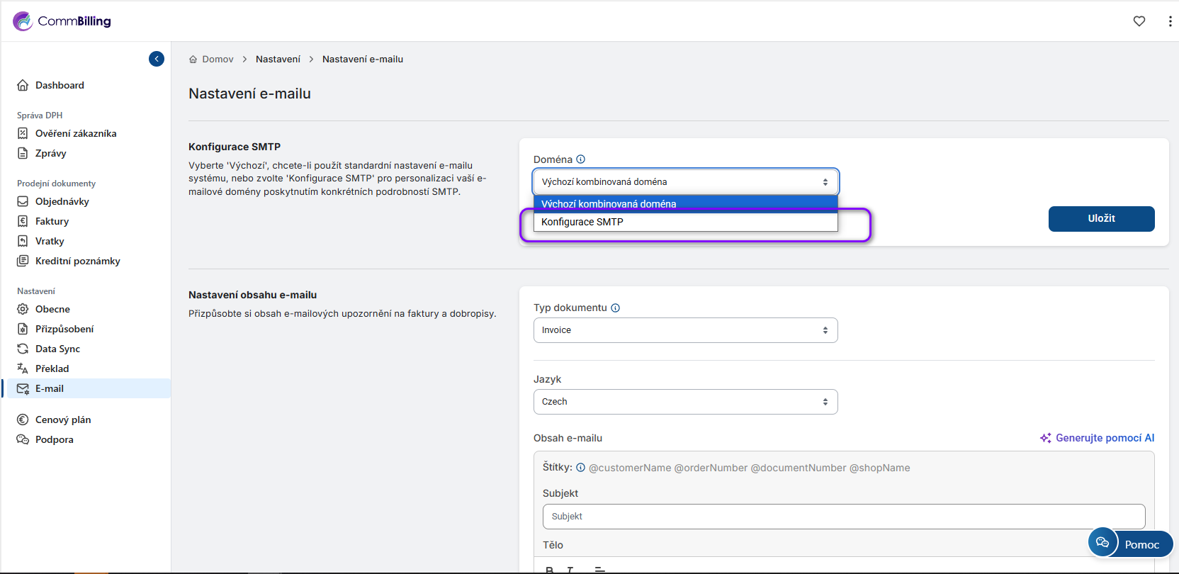 Ano, s CommBilling můžete použít vlastní e-mailovou doménu k odesílání faktur a dalších sdělení svým zákazníkům. Tato funkce je k dispozici výhradně pro uživatele plánu C-Business a umožňuje vám zvýšit profesionalitu a udržet konzistenci značky v komunikaci se zákazníky.