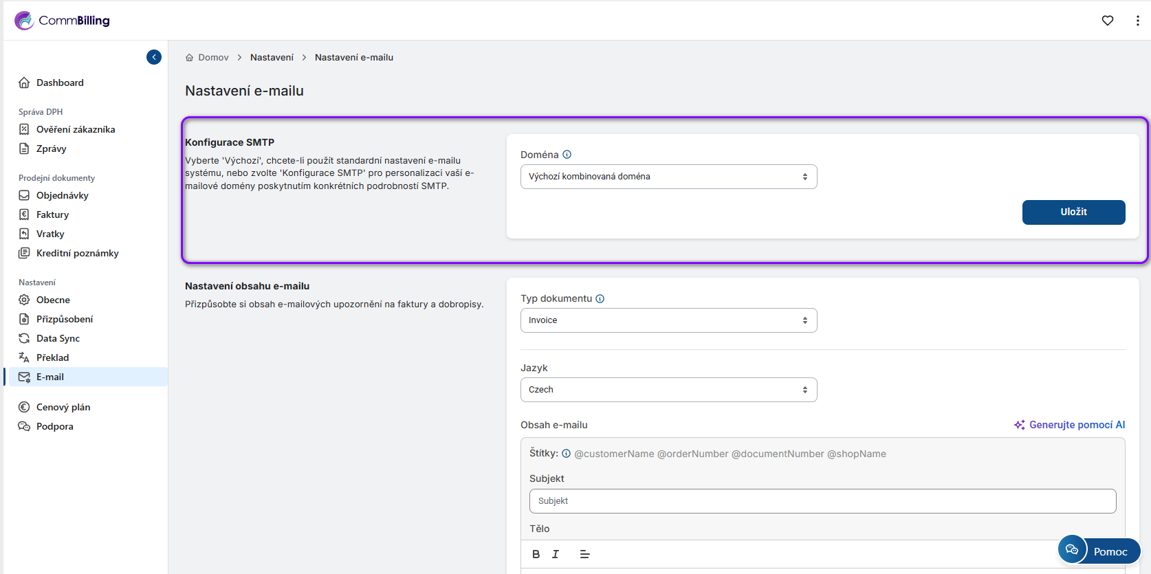 Nastavení e-mailů v CommBilling zajišťuje, že vaši zákazníci obdrží profesionální, značkovou komunikaci. Můžete přizpůsobit šablony, nastavit automatická e-mailová upozornění a konfigurovat obsah e-mailů pro odesílání. Pro nastavení e-mailů postupujte podle těchto kroků:
