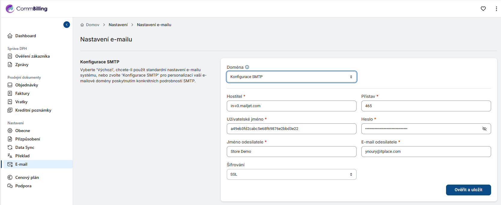 - Vybrat, zda si přizpůsobíte svá vlastní nastavení SMTP, nebo použijete server SMTP CommBilling.