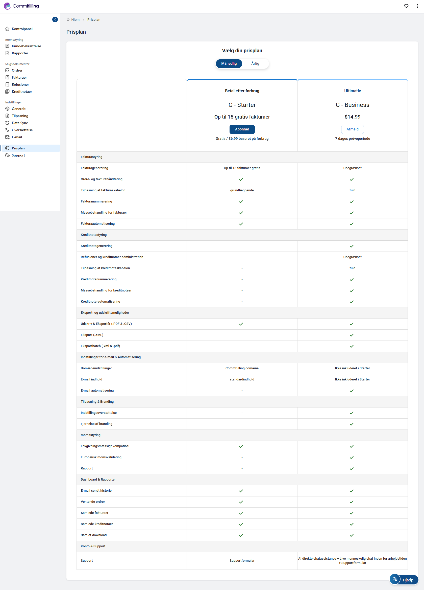 C-Business-planen fra CommBilling er designet til mere etablerede Shopify-butikker med større faktureringsbehov og avancerede faktureringskrav.