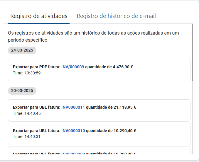 Afsnittet E-mailhistorik sporer alle e-mails, der er sendt fra CommBilling, herunder: