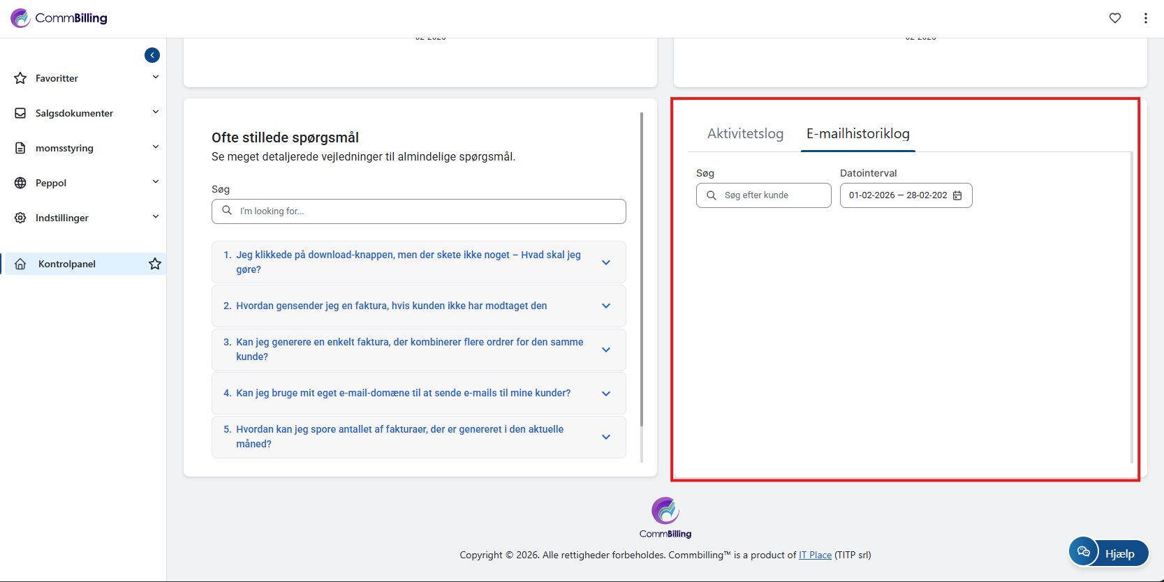 FAQ-afsnittet giver hurtig adgang til ofte stillede spørgsmål, artikler og vejledninger. Her finder du løsninger på almindelige problemer, tips til at maksimere CommBillings funktioner og fejlfindingsråd. Dette afsnit opdateres løbende for at sikre, at du har den support, du har brug for, lige ved hånden.