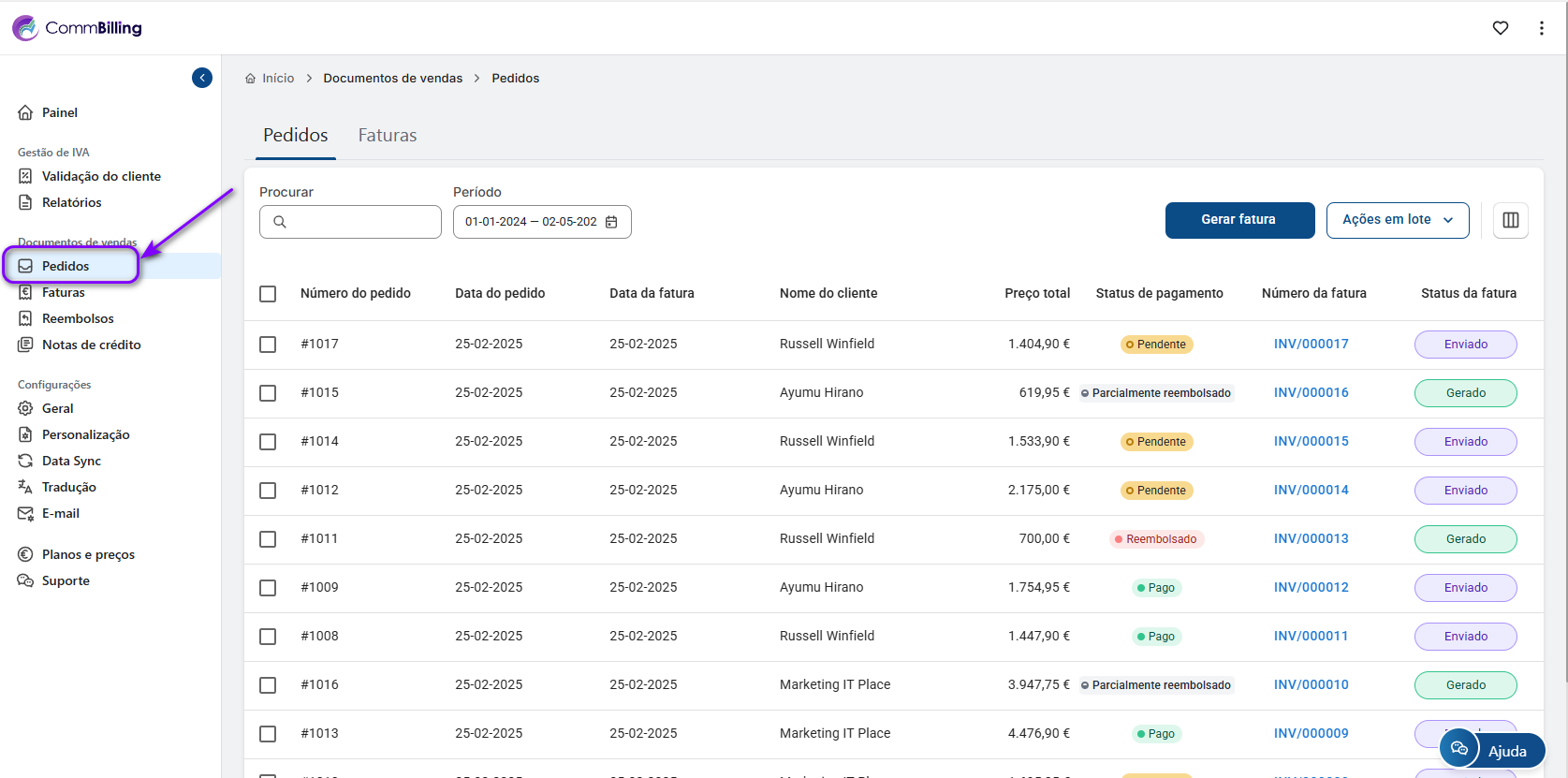 - Udfør handlinger på flere ordrer samtidigt, såsom generering af fakturaer eller eksport af ordredata.