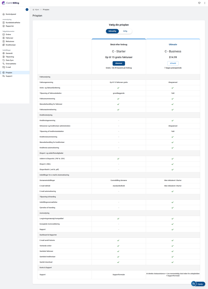 C-Business-planen fra CommBilling er designet til Shopify-butikker, der har brug for mere avancerede faktureringsværktøjer, større tilpasningsmuligheder og fleksibiliteten til at håndtere store transaktionsvolumener.