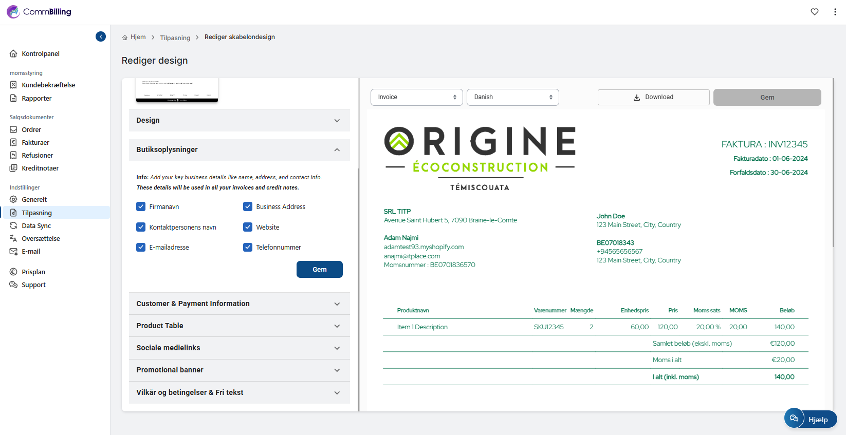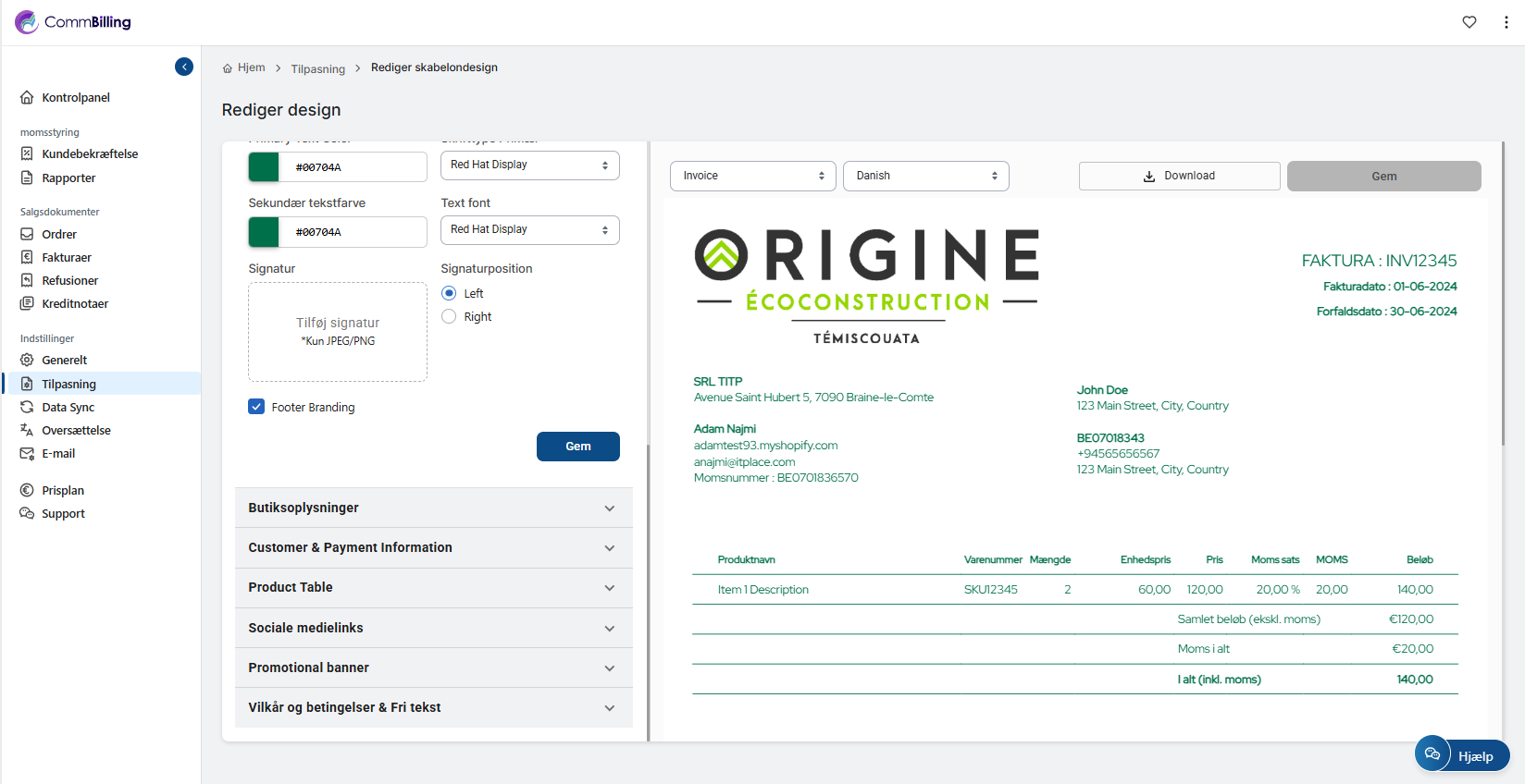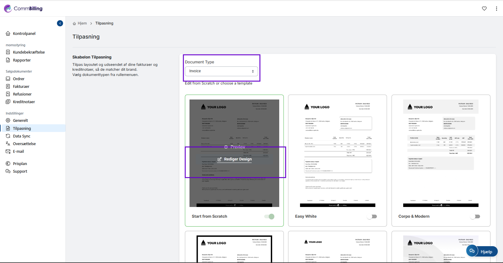 Du kan administrere og redigere dit fakturadesign direkte fra tilpasningsindstillingerne. Følg trinene nedenfor for at justere dit fakturalayout efter dine præferencer.