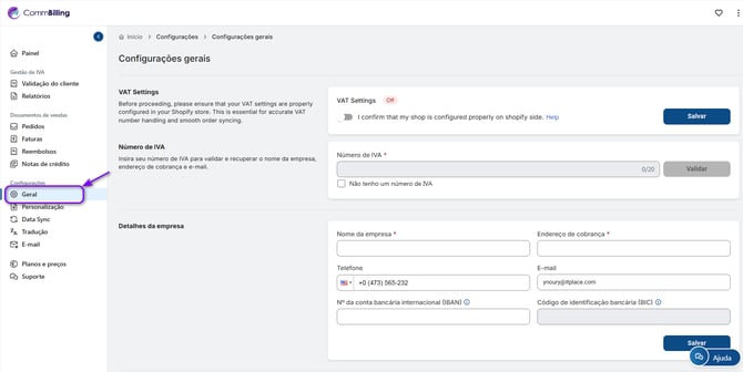 - Momsnummer: Indtast din virksomheds momsnummer for skatteoverholdelse og tryk på knappen Valider.