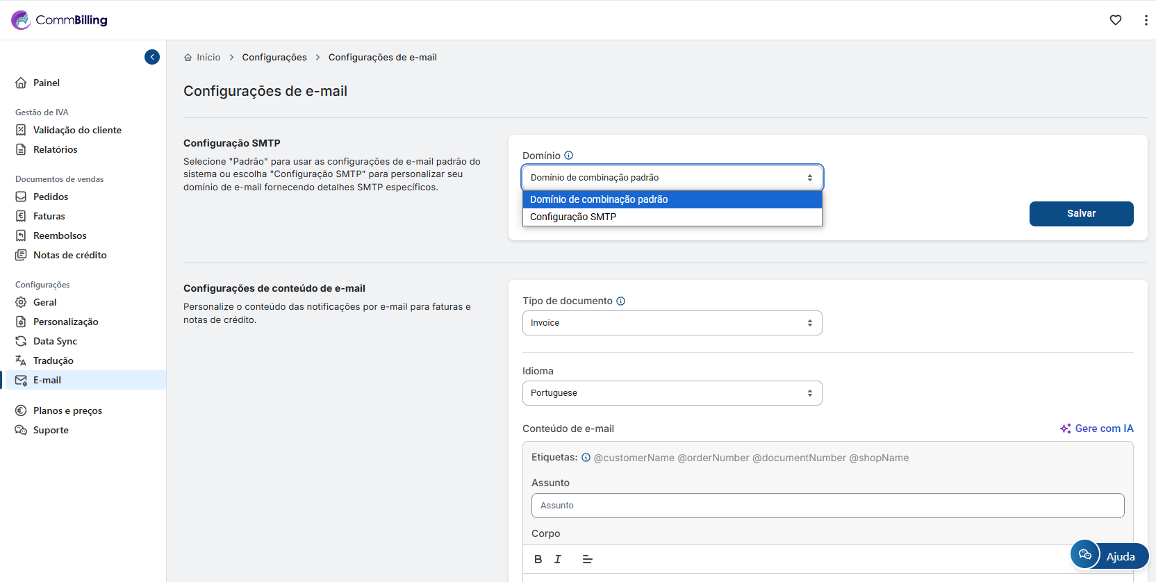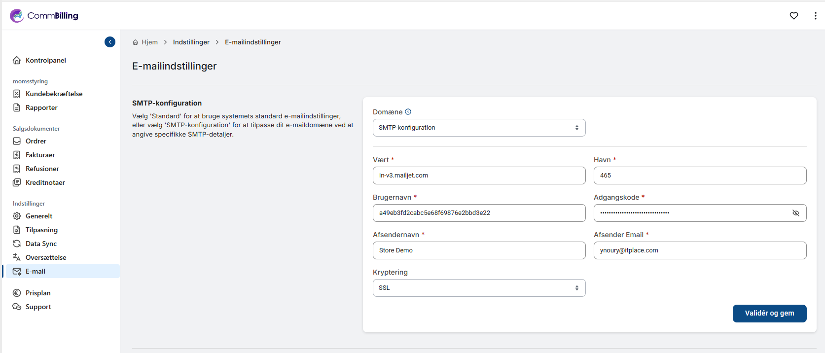 - Vælge enten at tilpasse dine egne SMTP-indstillinger eller bruge CommBillings SMTP-server.