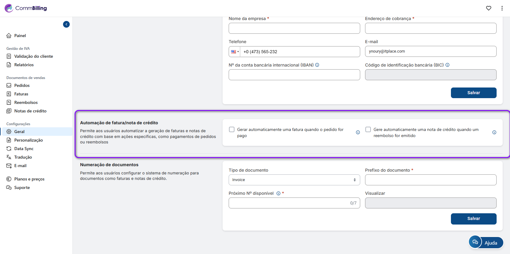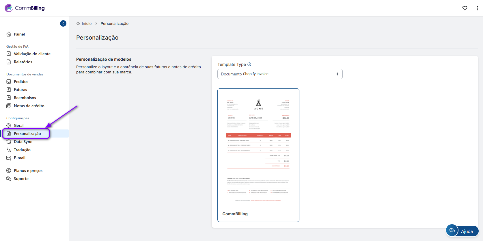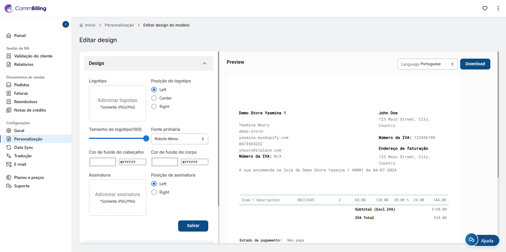 - Design af salgsdokumenter: Baseret på din abonnementsplan kan du helt eller delvist tilpasse designet af fakturaer og kreditnotaer, herunder tilføje din butiks logo, vælge farveskemaer og tilføje yderligere oplysninger som vilkår og betingelser, fjerne CommBilling branding osv.
