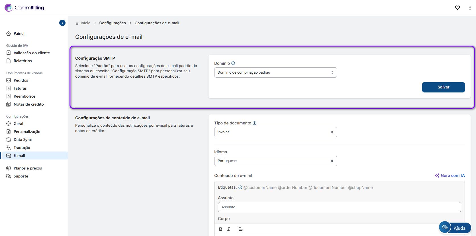 - SMTP-konfiguration: Afhængigt af din plan kan du enten bruge CommBillings SMTP-server eller konfigurere din egen, hvilket giver dig kontrol over, hvordan fakturaer, kreditnotaer og anden kommunikation sendes.