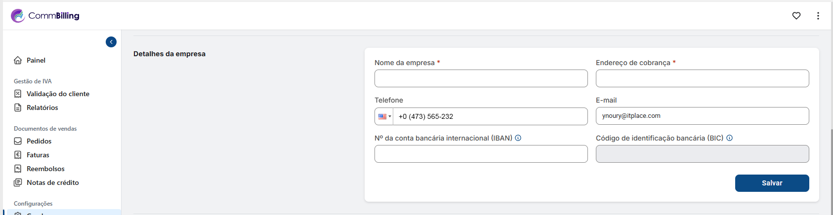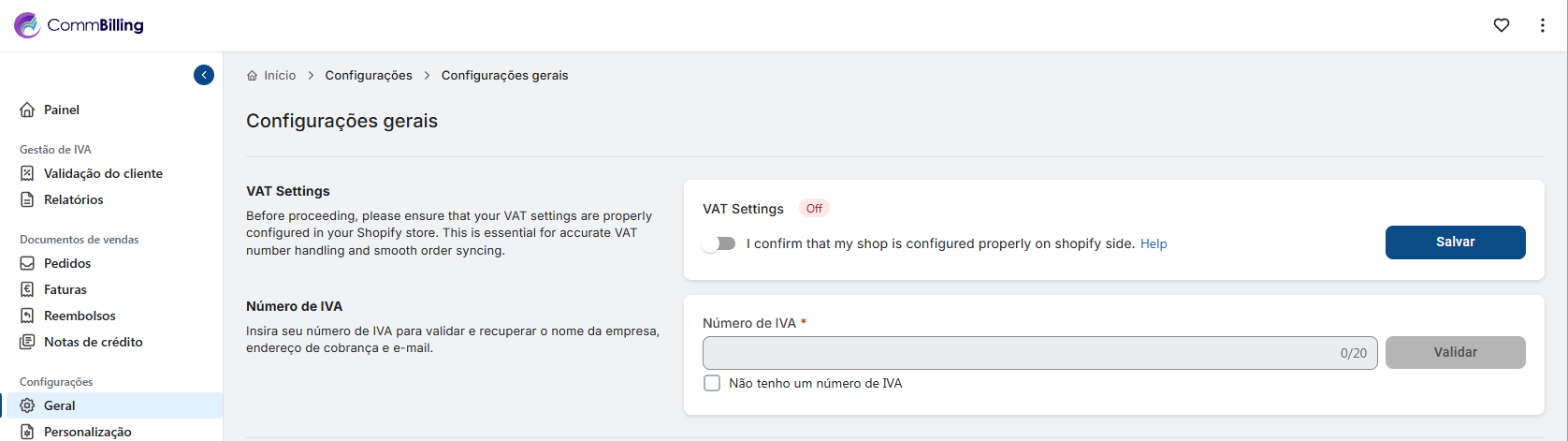 - Validering af virksomhedsmomsnummer: I dette afsnit kan du indtaste og validere din butiks momsnummer. CommBilling kontrollerer automatisk gyldigheden af momsnummeret for at sikre, at din virksomhed forbliver i overensstemmelse med EU's momsregler.