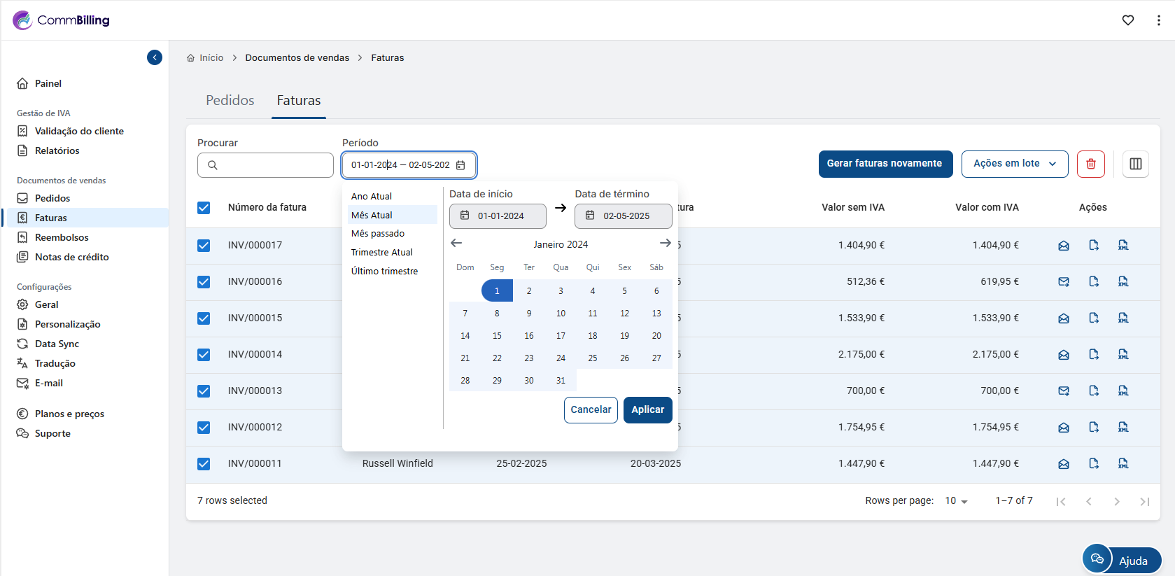 CommBilling giver dig mulighed for at generere detaljerede fakturarapporter filtreret efter dato, hvilket hjælper dig med at analysere dit salg og spore fakturaer for specifikke perioder.