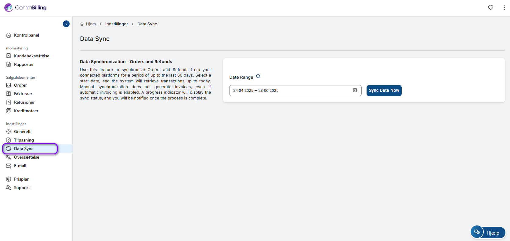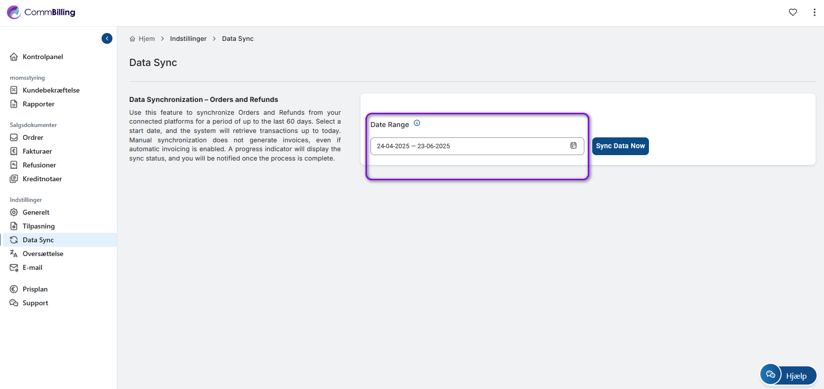 Denne funktion er især nyttig under onboarding, når du tester din faktureringsopsætning, eller i tilfælde af integrationsforsinkelser. Den er designet til at sikre, at dine historiske data, op til 60 dage tilbage, er fuldt ud afstemt, uden at du behøver at vente på den næste automatiske synkroniseringscyklus.