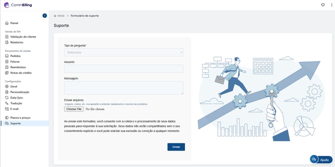 Fanen Support i CommBilling giver brugerne en nem måde at kontakte supportteamet direkte. Uanset om du har brug for hjælp til fejlfinding af et problem eller ønsker at give feedback, er dette afsnit designet til at gøre det ligetil og effektivt at få hjælp.