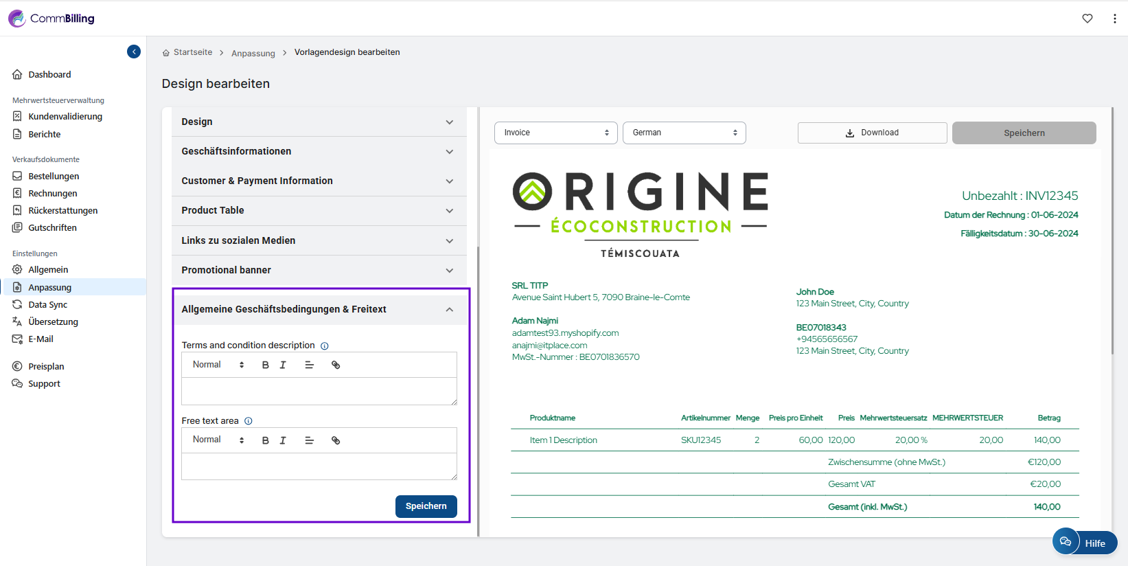 Die Anpassung Ihrer Zahlungsanweisungen ermöglicht es Ihnen, klar zu kommunizieren, wie Kunden ihre Zahlungen durchführen sollen, und spiegelt gleichzeitig die bevorzugten Bedingungen und die Professionalität Ihres Unternehmens wider. In CommBilling können Sie den Abschnitt mit den Zahlungsanweisungen auf Ihren Rechnungen ganz einfach bearbeiten, um Bankdaten, Zahlungsbedingungen oder besondere Hinweise hinzuzufügen, die reibungslose Transaktionen erleichtern.