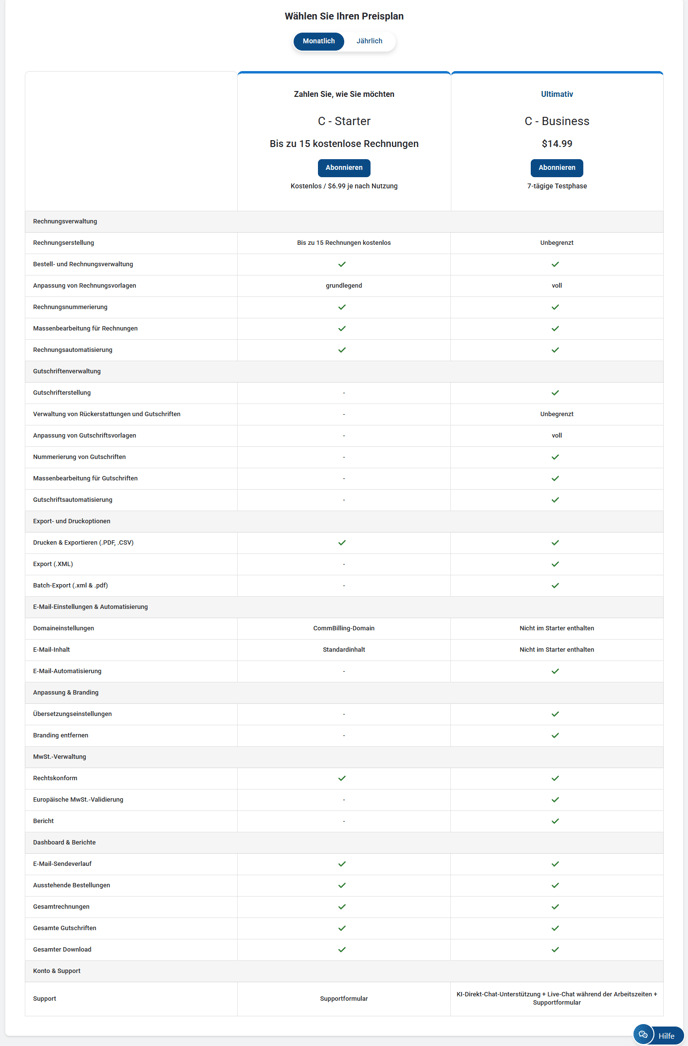 Der C-Business Plan von CommBilling bietet eine fortschrittliche, funktionsreiche Abrechnungslösung für Shopify-Besitzer mit einer Reihe von Funktionen, die eine größere Flexibilität, Automatisierung und die Einhaltung der europäischen Vorschriften ermöglichen.