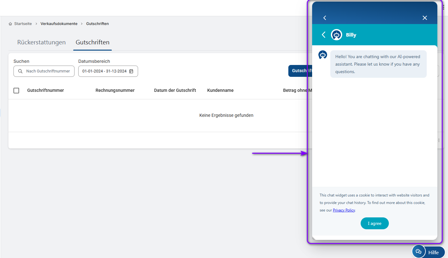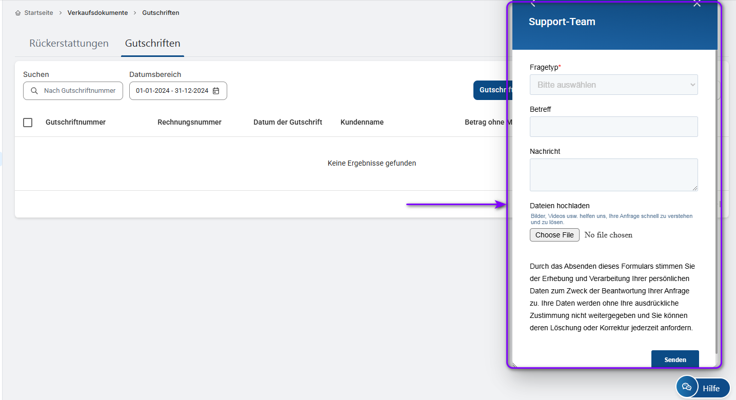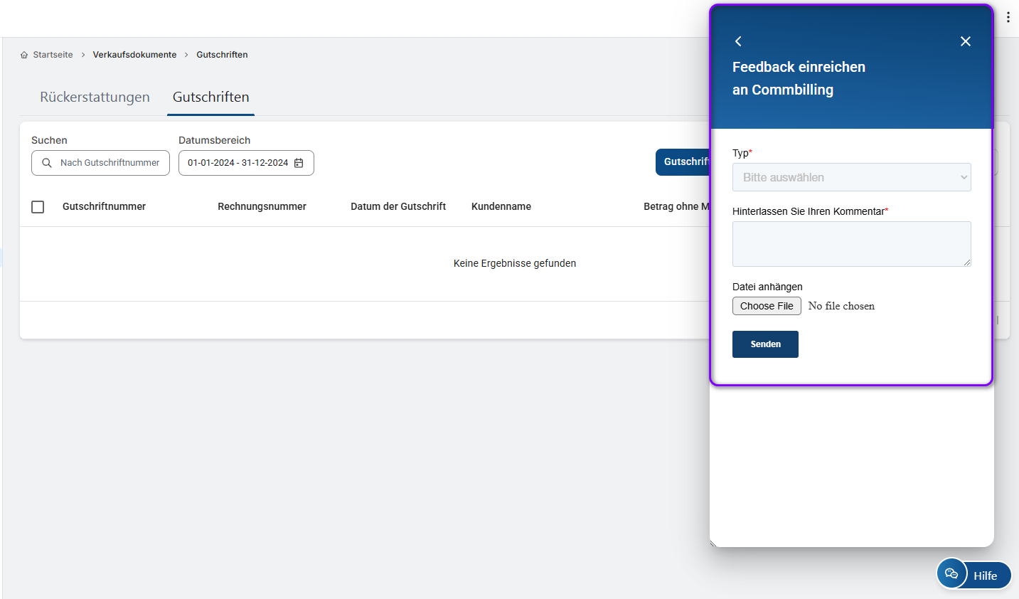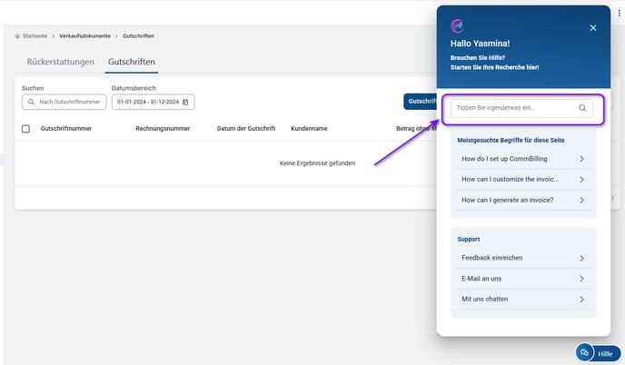 Mit der Hilfe-Schaltfläche haben Sie einfachen Zugang zu allen Anleitungen und Hilfestellungen, die Sie benötigen, um CommBilling optimal nutzen zu können. Egal, ob Sie es vorziehen, selbst nach Antworten zu suchen oder sich an das Support-Team zu wenden, diese Ressourcen stellen sicher, dass Sie alle Probleme schnell und effizient lösen können.