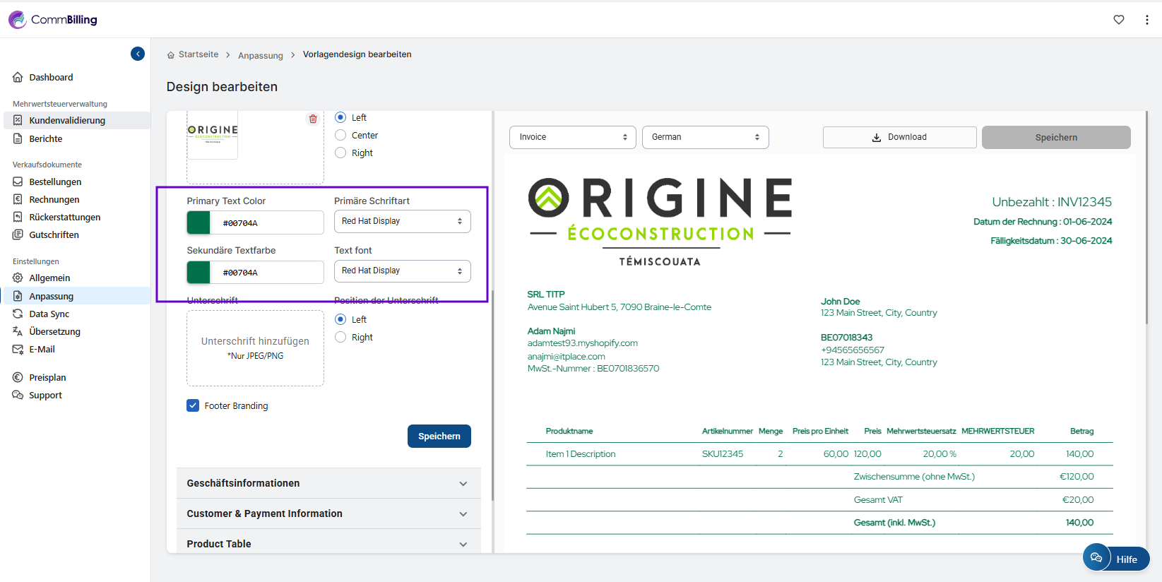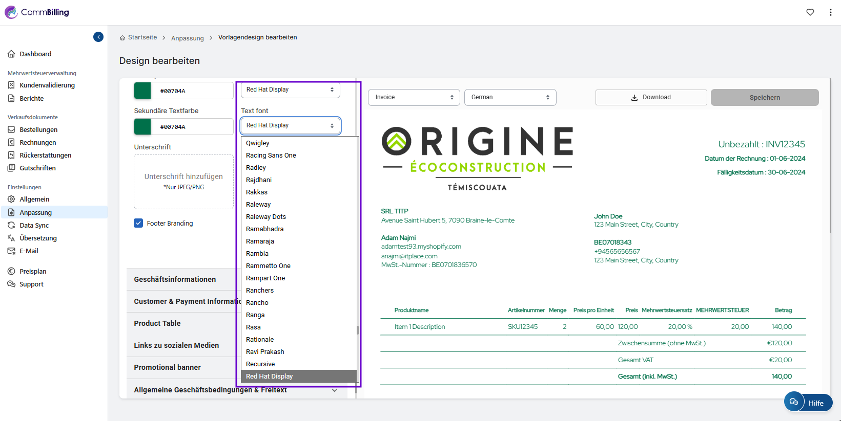 Die Anpassung der Schriftarten auf Ihren Rechnungen verbessert die visuelle Kohärenz Ihrer Marke und stärkt das professionelle Erscheinungsbild Ihrer Finanzdokumente. Mit CommBilling können Sie die Typografie ganz einfach an den Stil Ihres Unternehmens anpassen und sicherstellen, dass jede Rechnung, die Sie versenden, einen starken und konsistenten Eindruck hinterlässt.