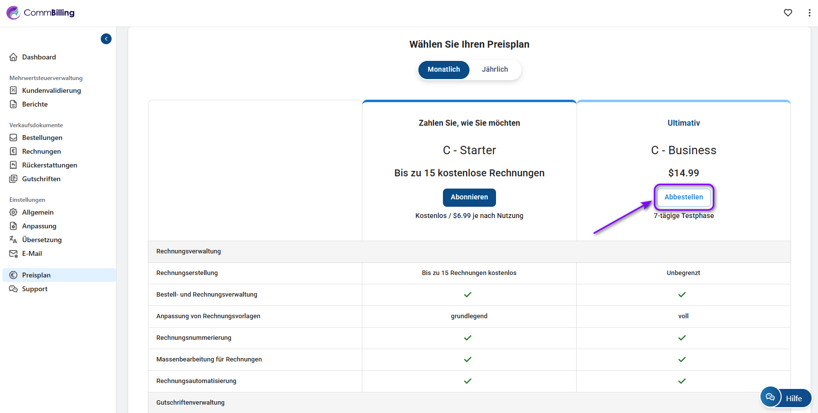 Wichtiger Hinweis: Wenn Sie sich erneut für den C-Business-Plan anmelden, ist die kostenlose Testphase nicht mehr verfügbar, und die Gebühren beginnen sofort mit der Anmeldung.