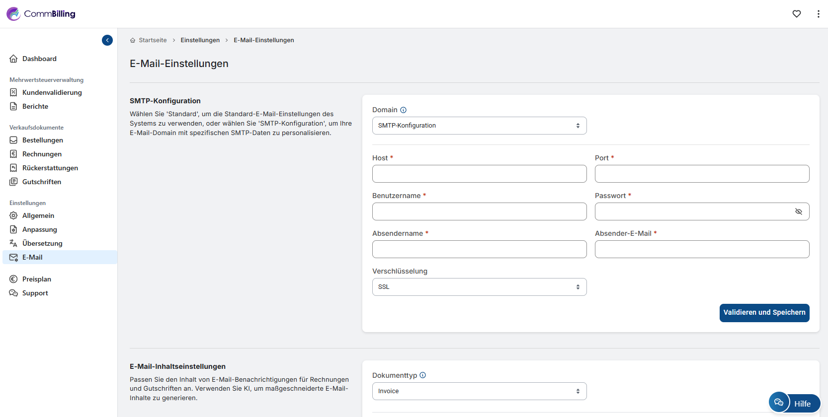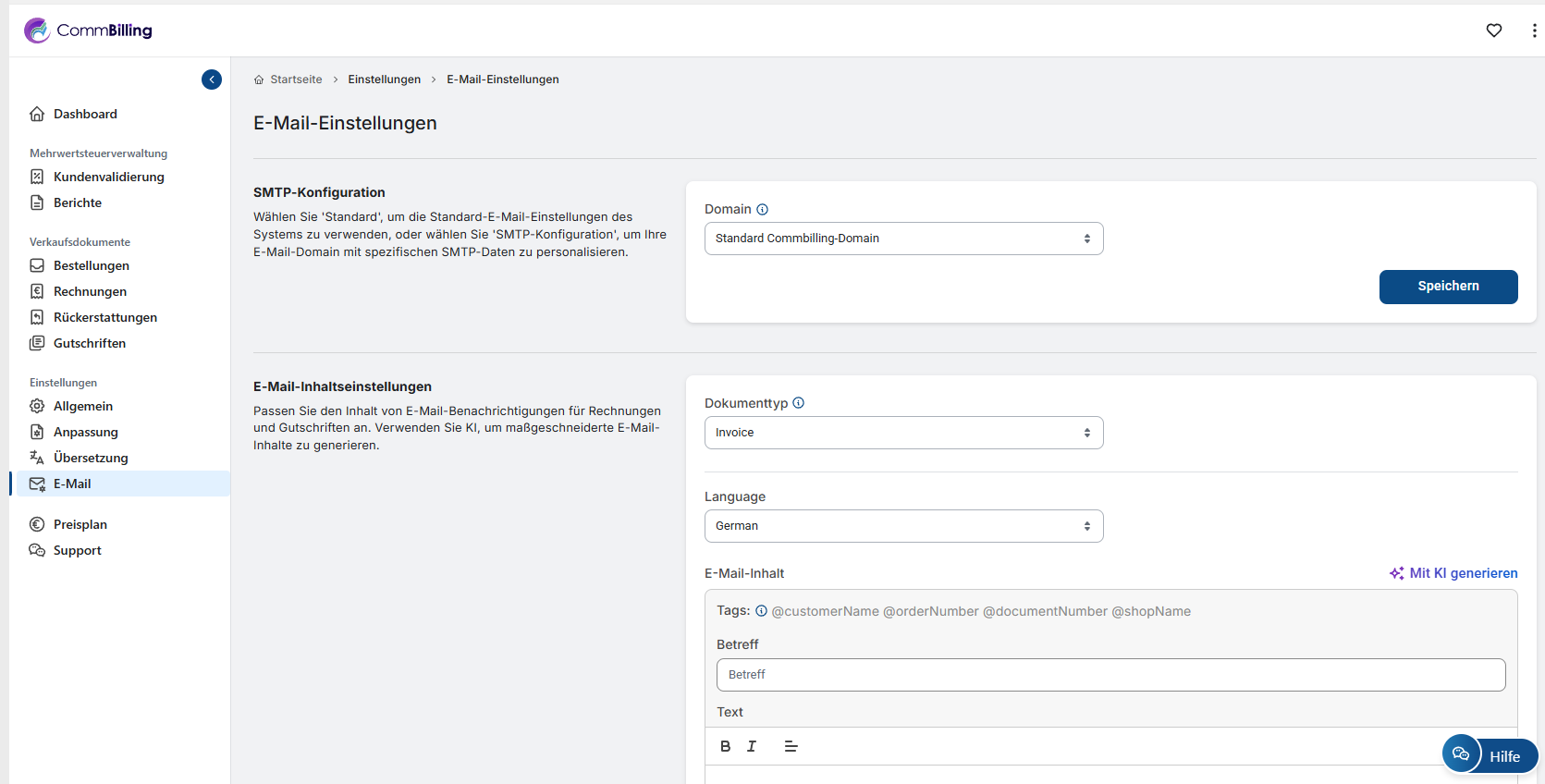 Ja, mit CommBilling können Sie Ihre eigene E-Mail-Domäne verwenden, um Rechnungen und andere Mitteilungen an Ihre Kunden zu senden. Diese Funktion steht ausschließlich Nutzern des C-Business-Plans zur Verfügung und ermöglicht es Ihnen, die Professionalität zu erhöhen und die Markenkonsistenz in Ihrer Kundenkommunikation zu wahren.