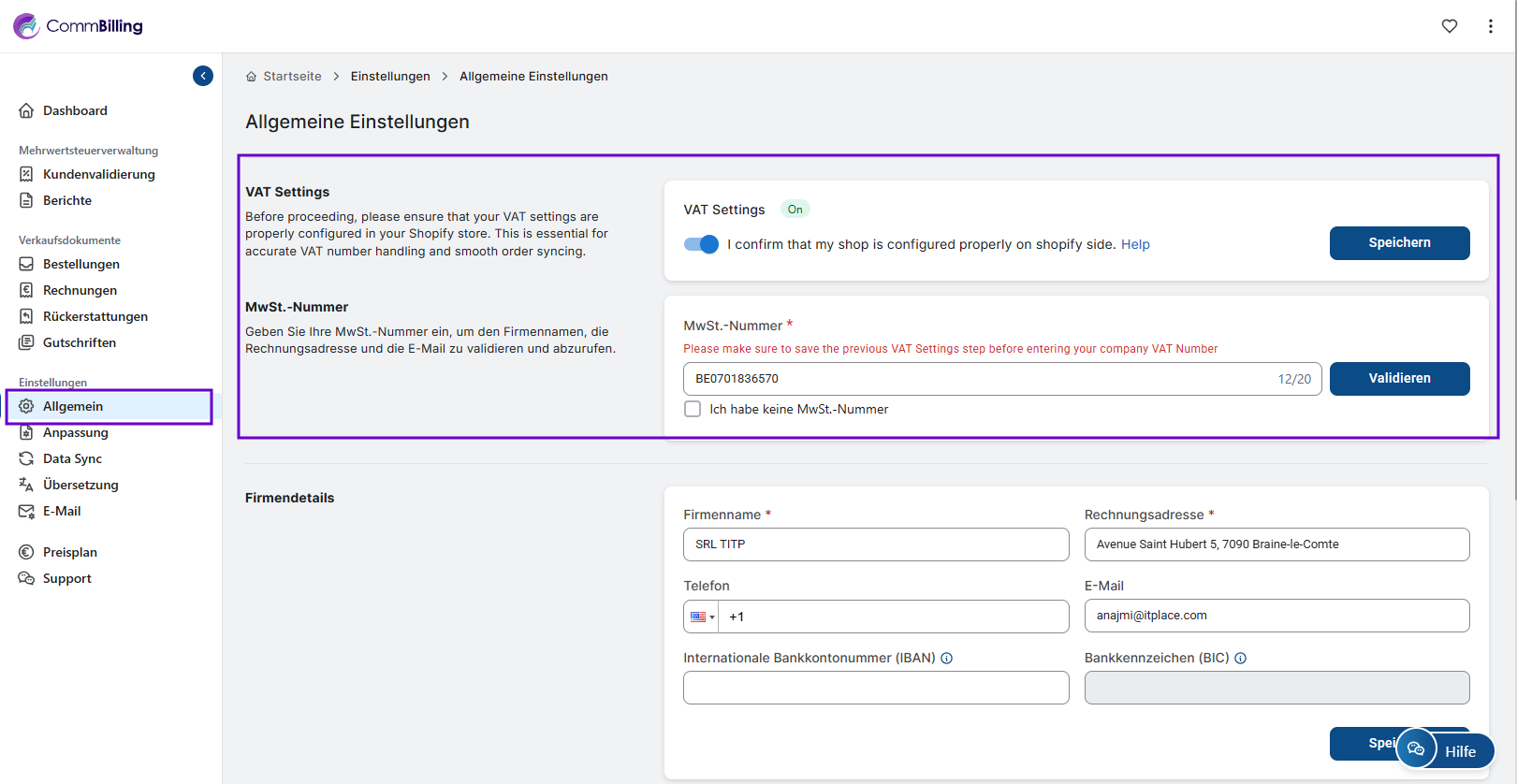 Die Konfiguration Ihrer Allgemeinen Einstellungen ist ein wichtiger Schritt um Compliance Genauigkeit und operative Effizienz sicherzustellen. Sobald diese Einrichtung abgeschlossen ist kann CommBilling Ihre Bestellungen korrekt synchronisieren Mehrwertsteuerdaten validieren und einheitliche Informationen in allen Verkaufsdokumenten anwenden. Diese Grundlage sorgt vom ersten Moment an für einen reibungslosen und professionellen Abrechnungsprozess.