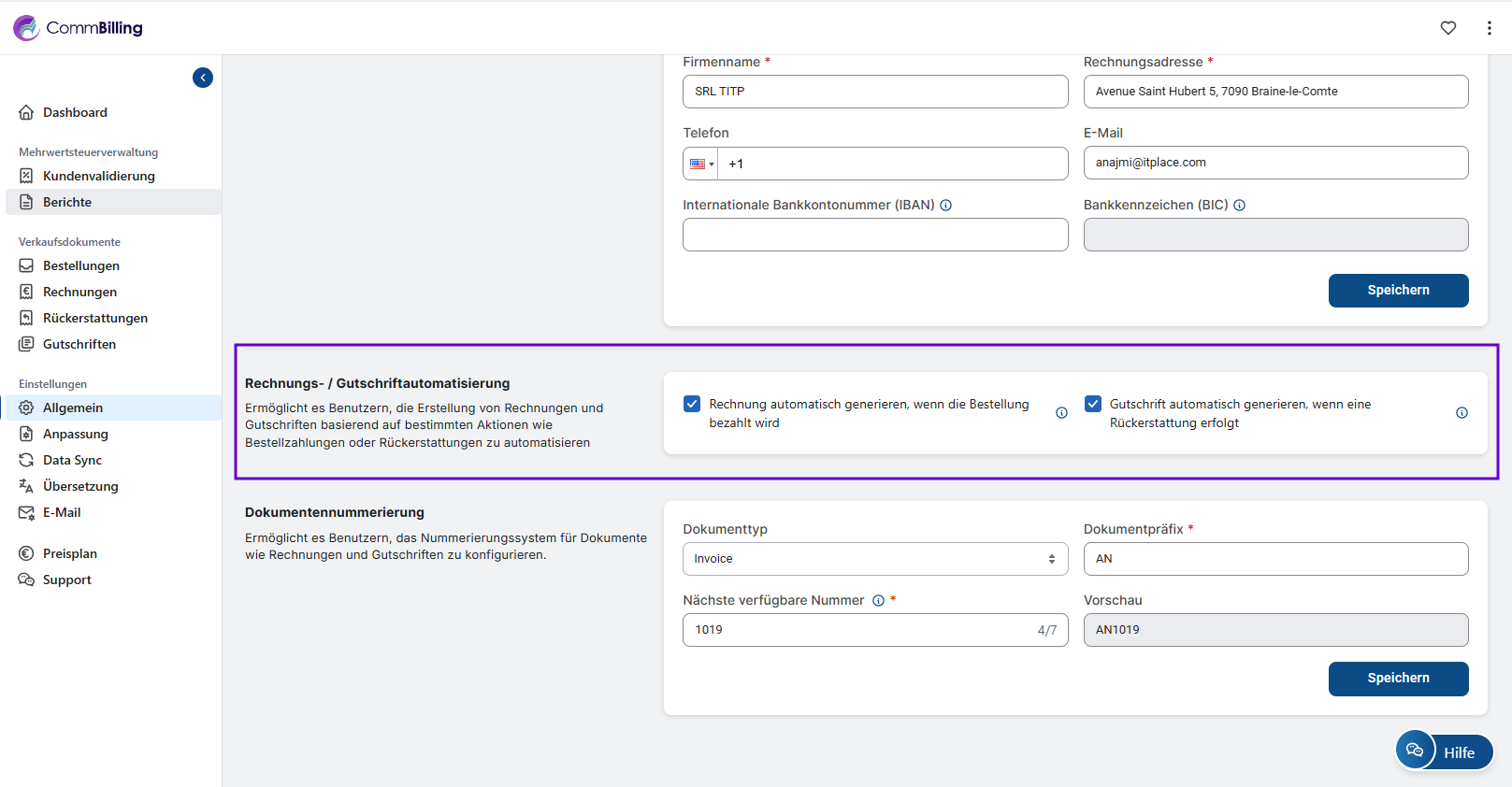 Der Abschnitt Allgemeine Einstellungen bildet die Grundlage Ihrer CommBilling Konfiguration. Er stellt sicher dass Ihre Unternehmensinformationen die Umsatzsteuer Validierung die Dokumentnummerierung und die Automatisierungsregeln korrekt eingerichtet sind bevor Sie mit der Erstellung von Rechnungen oder Gutschriften beginnen. Eine korrekte Einrichtung in diesem Bereich garantiert Genauigkeit Compliance und einen reibungslosen täglichen Betrieb.