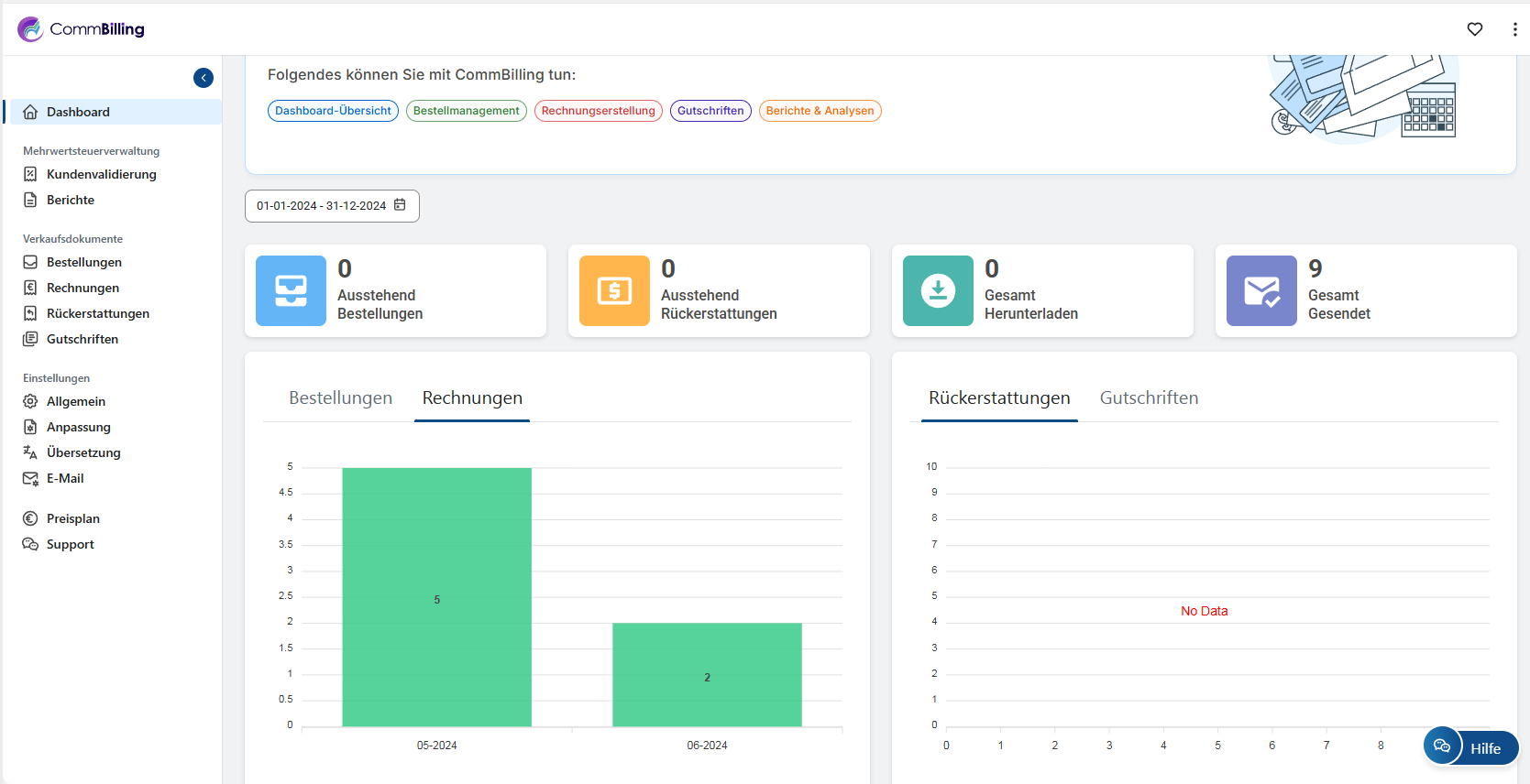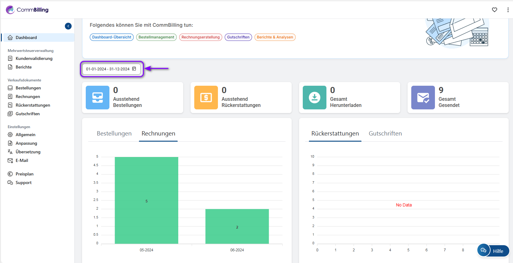 - Navigieren Sie im linken Menü von CommBilling zum Dashboard.