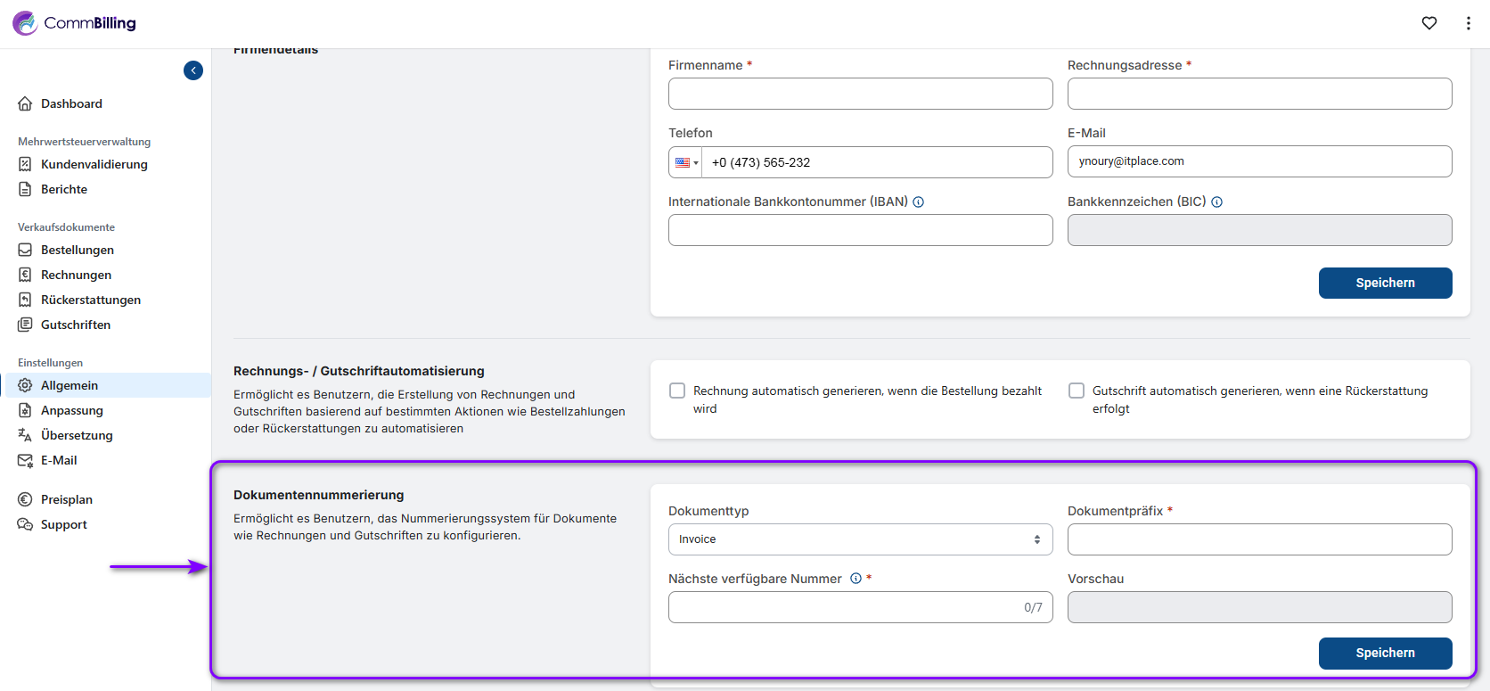 - Schritt 3: Suchen Sie den Abschnitt Belegnummerierung und legen Sie Ihr Rechnungsnummerierungsformat fest.