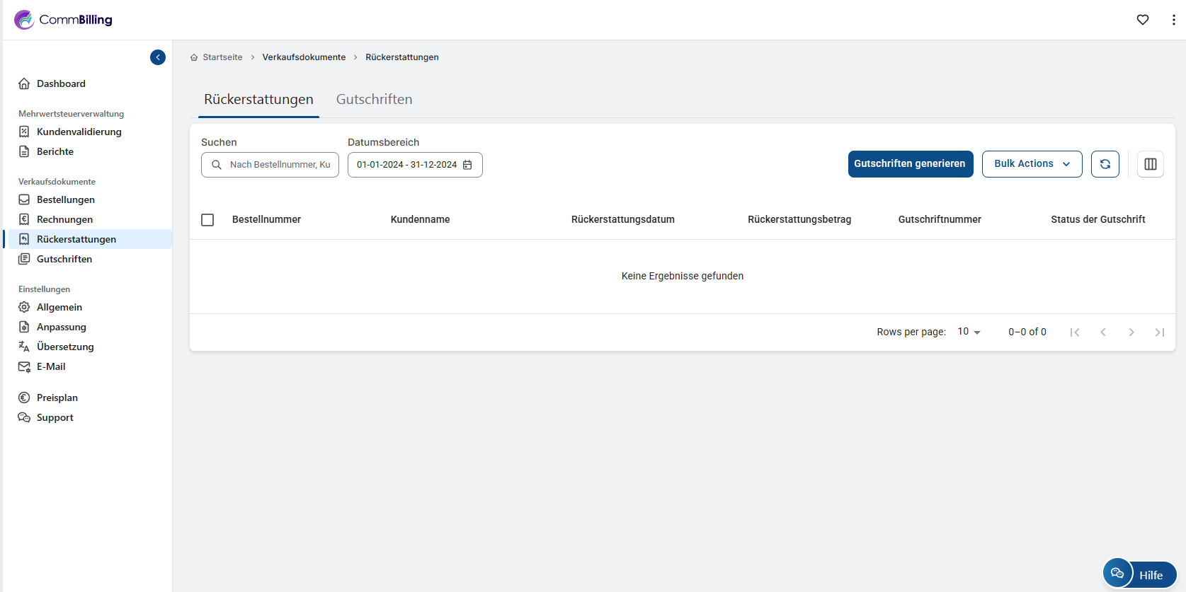 2. Öffnen Sie CommBilling und gehen Sie zum Abschnitt Verkaufsdokumente, gefolgt vom Tab Rückerstattungen.