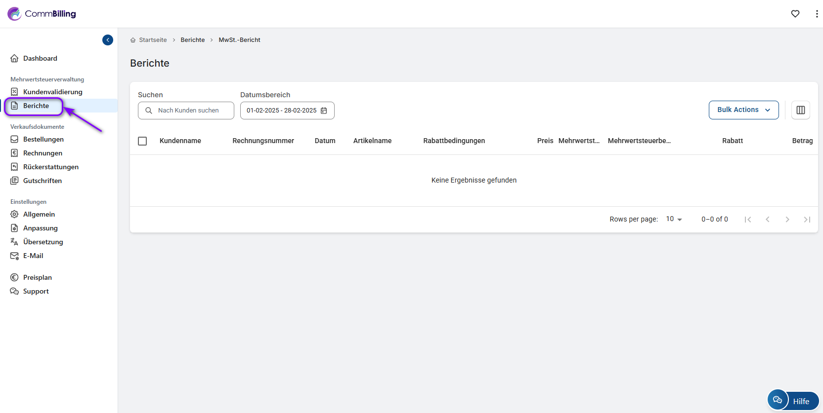 Gehen Sie im Hauptmenü zum Abschnitt Umsatzsteuerverwaltung und klicken Sie auf den Tab Berichte.