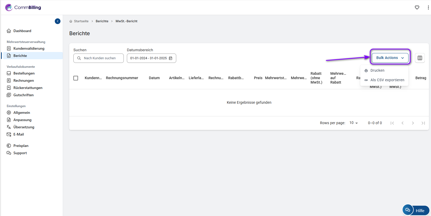Die Erstellung und Verwaltung von Umsatzsteuer- und Steuerberichten in CommBilling ist effizient und benutzerfreundlich. Mit Funktionen wie dem Massendruck und -export stellt die Plattform sicher, dass die Handhabung Ihrer Steuerdaten nahtlos erfolgt.
