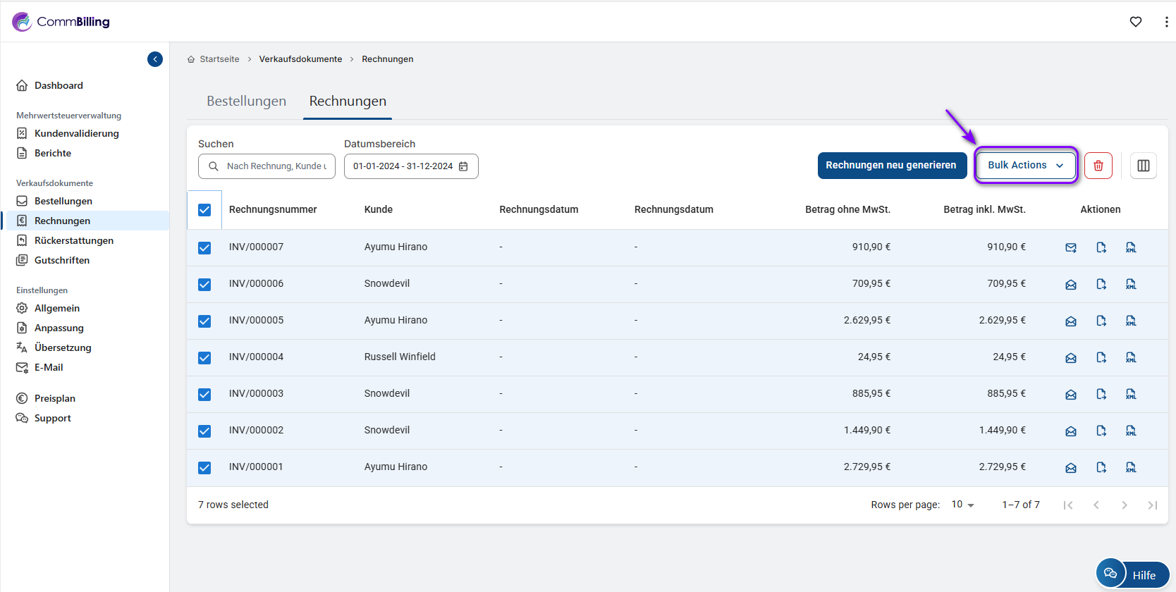 4. Klicken Sie oben in der Rechnungsliste auf Massenaktion.