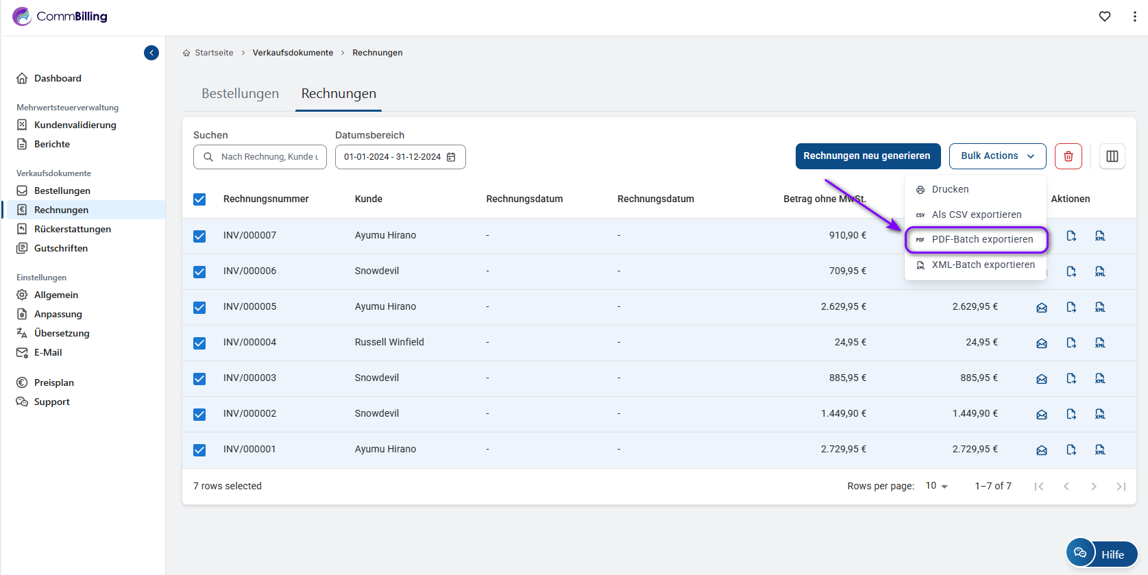 Wie exportiere ich Rechnungen als PDF-Stapel?