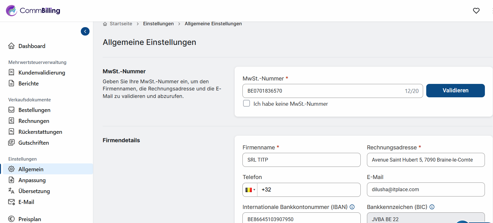 • Umsatzsteuer-Identifikationsnummer: Geben Sie die Umsatzsteuer-Identifikationsnummer Ihres Unternehmens für die Steuerkonformität ein und drücken Sie die Schaltfläche Validieren.