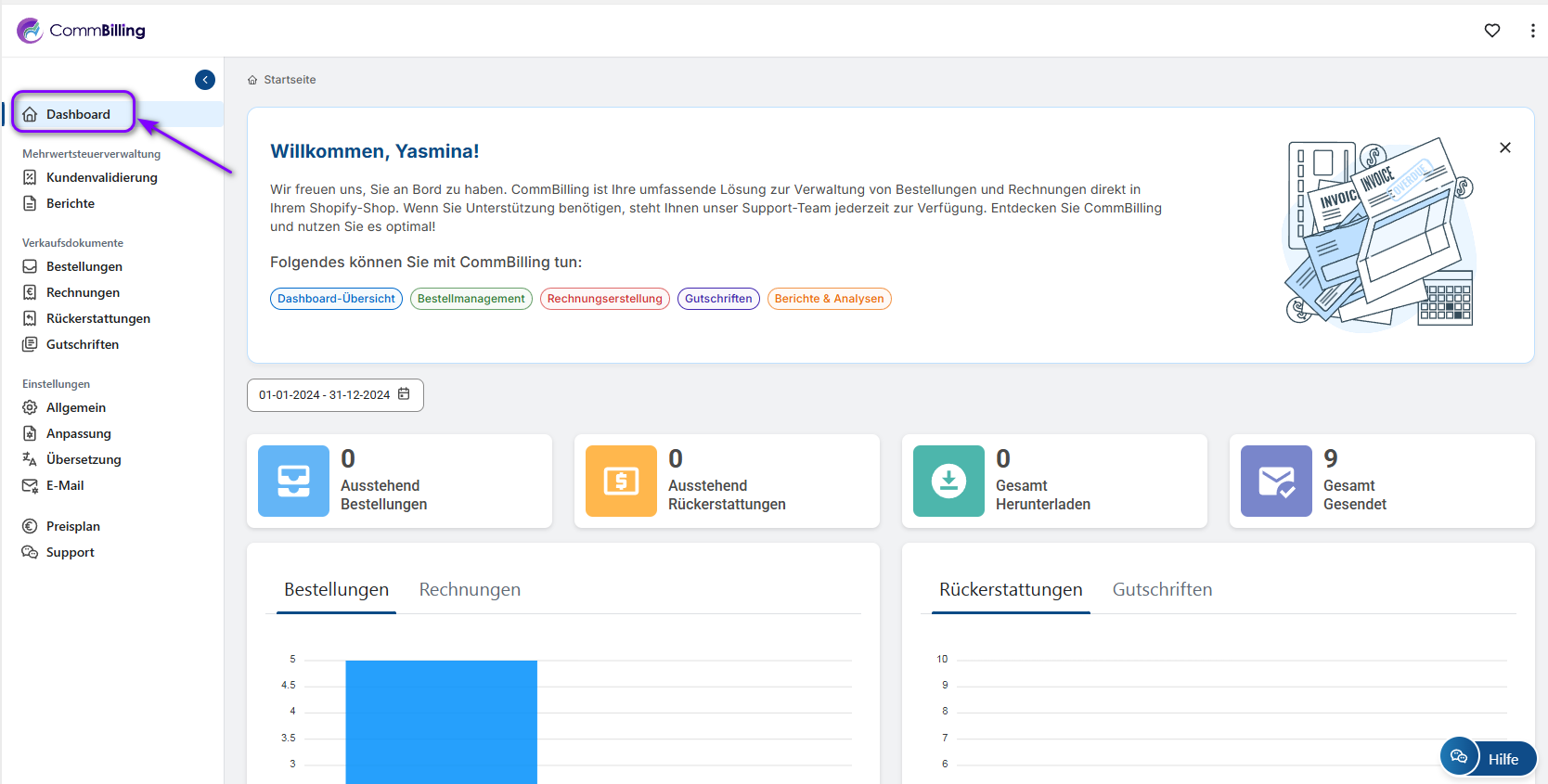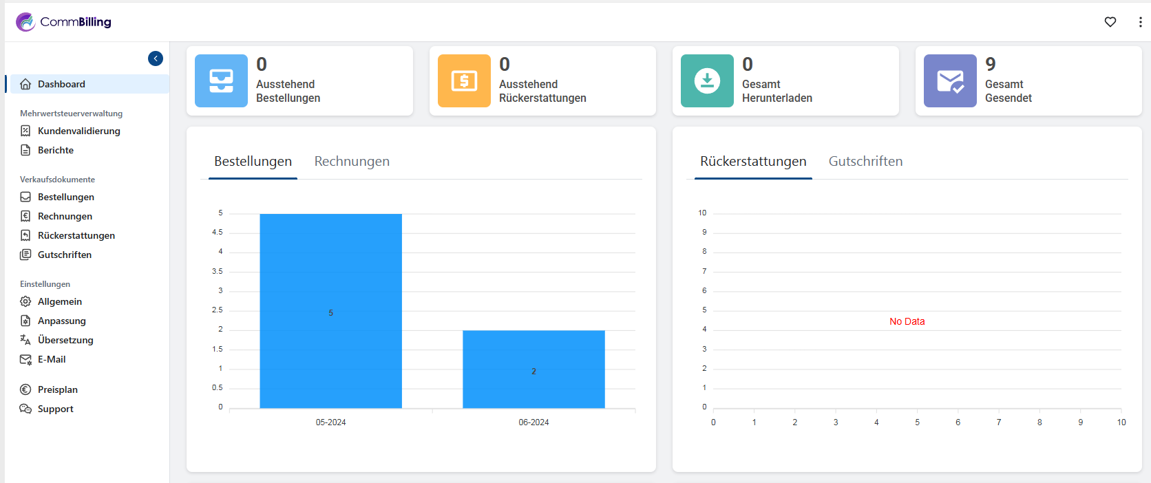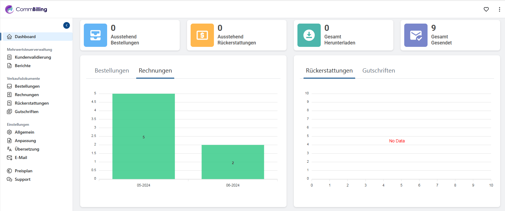 Mit CommBilling können Sie die Anzahl der im aktuellen Monat erstellten Rechnungen direkt über das Dashboard überwachen. Folgen Sie diesen Schritten, um diese Informationen einfach nachzuverfolgen: