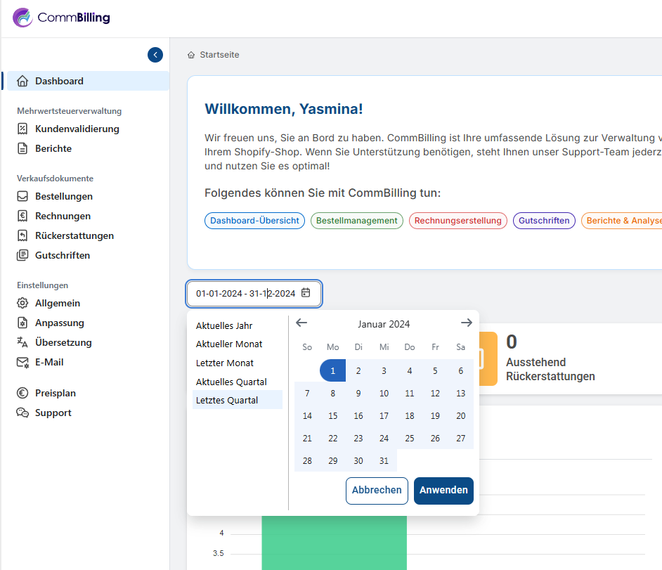Wenn Sie detailliertere Einblicke benötigen, gehen Sie zum Tab Rechnungen im Hauptmenü, um eine ausführliche Auflistung aller in diesem Zeitraum erstellten Rechnungen zu erhalten.