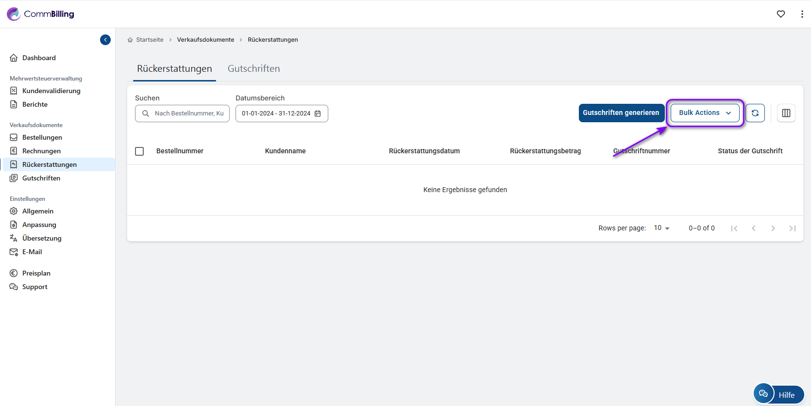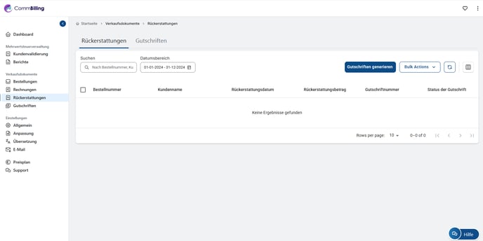 Die Verwaltung und Nachverfolgung von Rückerstattungen in CommBilling ist einfach, mit einer speziellen Registerkarte für Rückerstattungen, die einen umfassenden Überblick über alle Rückerstattungstransaktionen bietet. Diese Registerkarte enthält hilfreiche Funktionen wie Suche, Filter und Massenaktionen, um die Erstattungsverwaltung zu optimieren.
