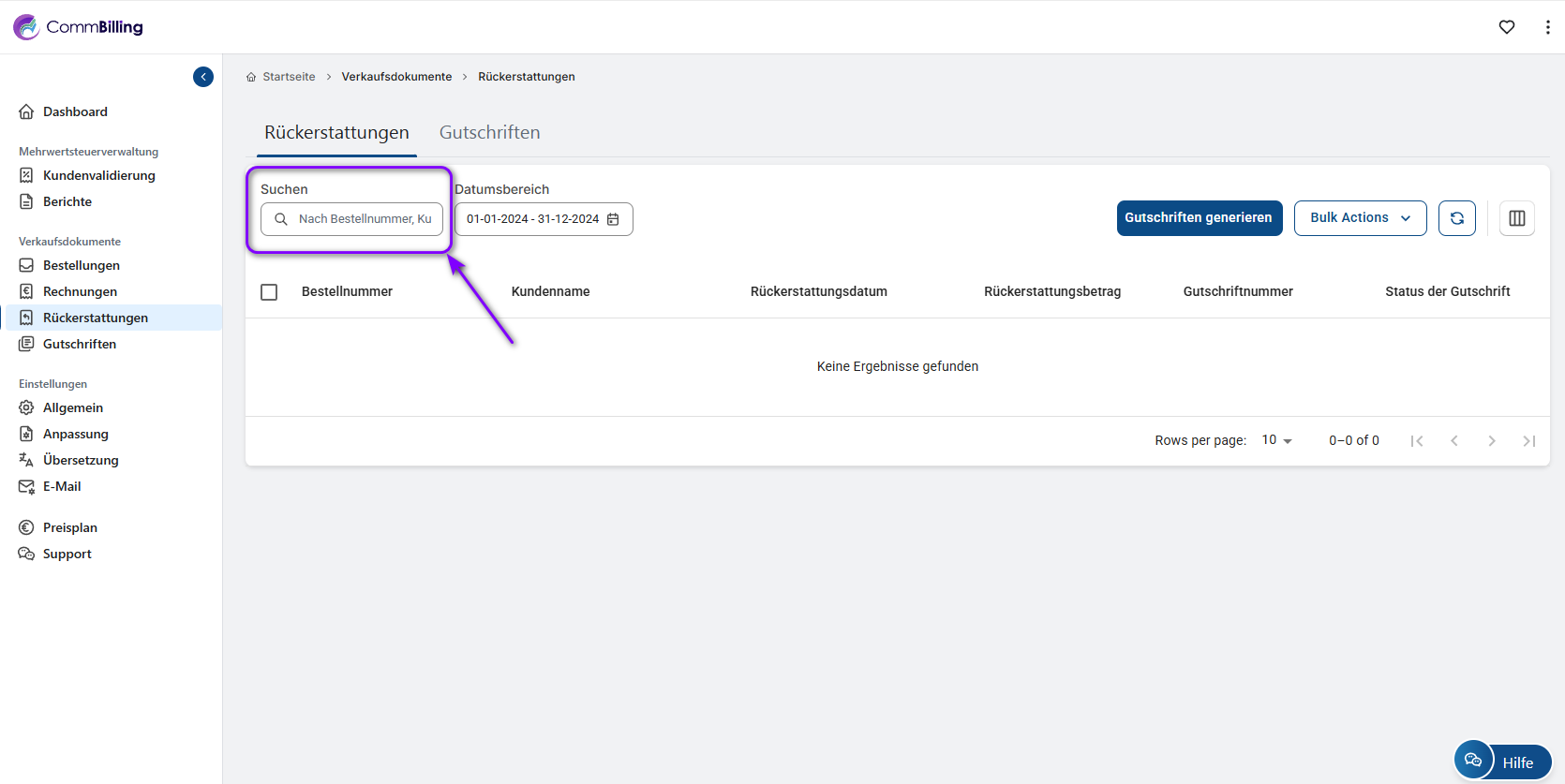 Mit der Suchleiste oben auf der Rückerstattung können Sie schnell bestimmte Erstattungen finden, indem Sie Schlüsselwörter eingeben, z. B. den Namen des Kunden oder die Rechnungsnummer. Dies ist besonders nützlich, um bestimmte Transaktionen innerhalb einer großen Menge von Erstattungen zu finden.