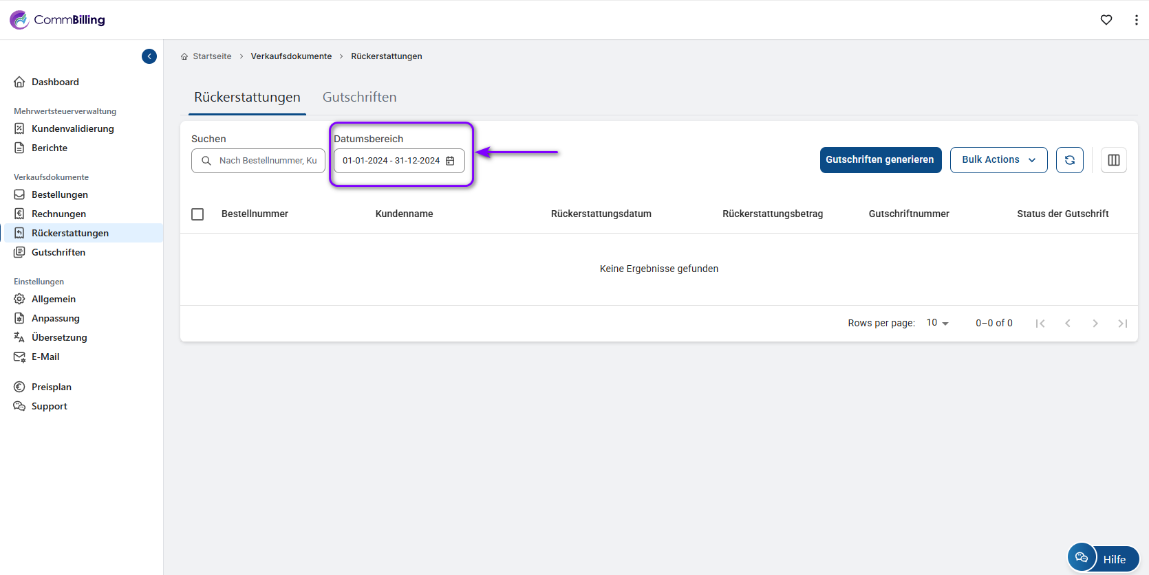 Um Erstattungen innerhalb eines bestimmten Zeitraums anzuzeigen, verwenden Sie den Datumsbereichsfilter. Durch Auswahl eines bestimmten Datumsbereichs können Sie die Liste schnell auf Erstattungen eingrenzen, die innerhalb dieses Zeitraums ausgegeben wurden. Diese Funktion ist hilfreich für monatliche oder vierteljährliche Finanzüberprüfungen.